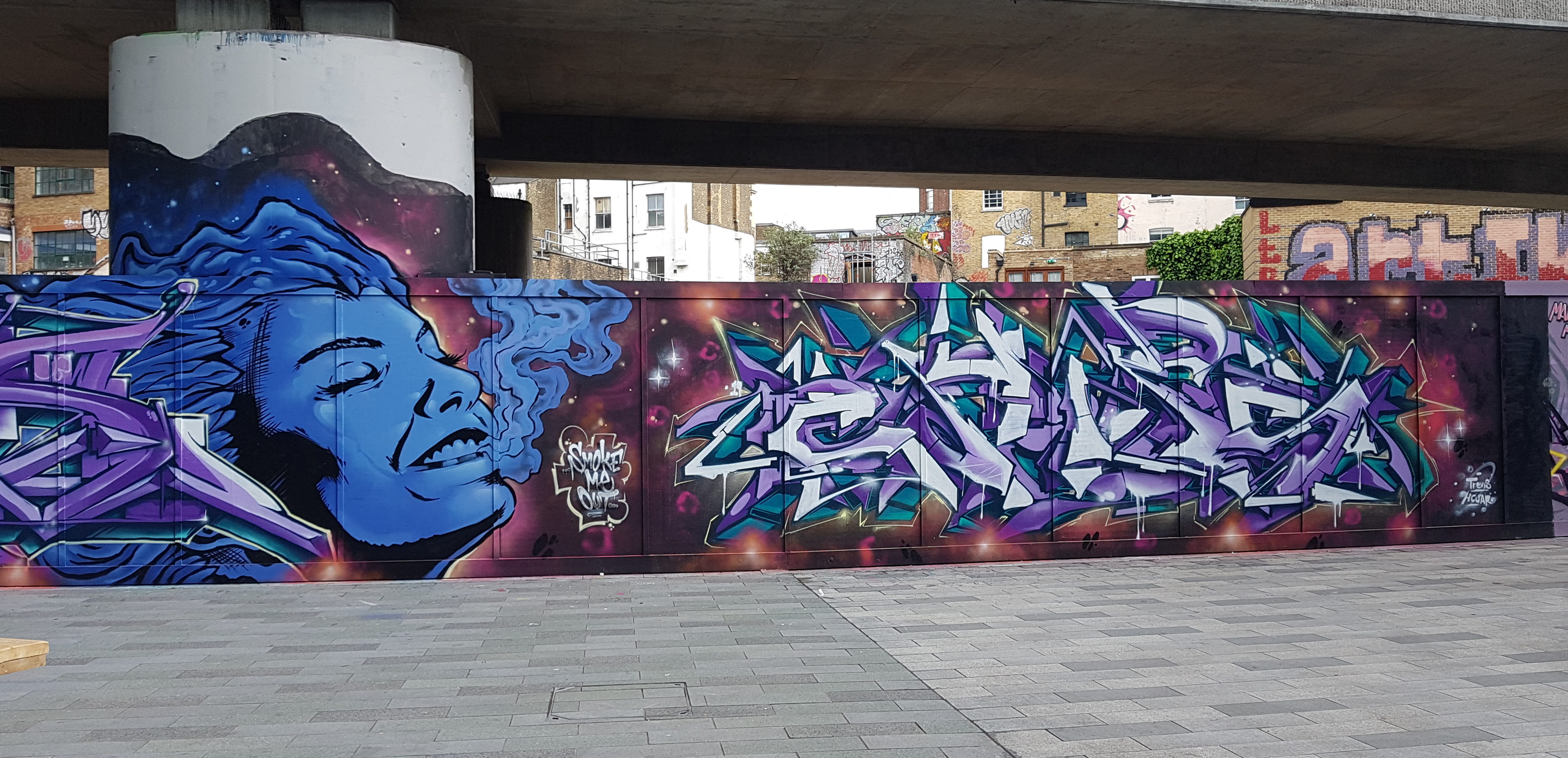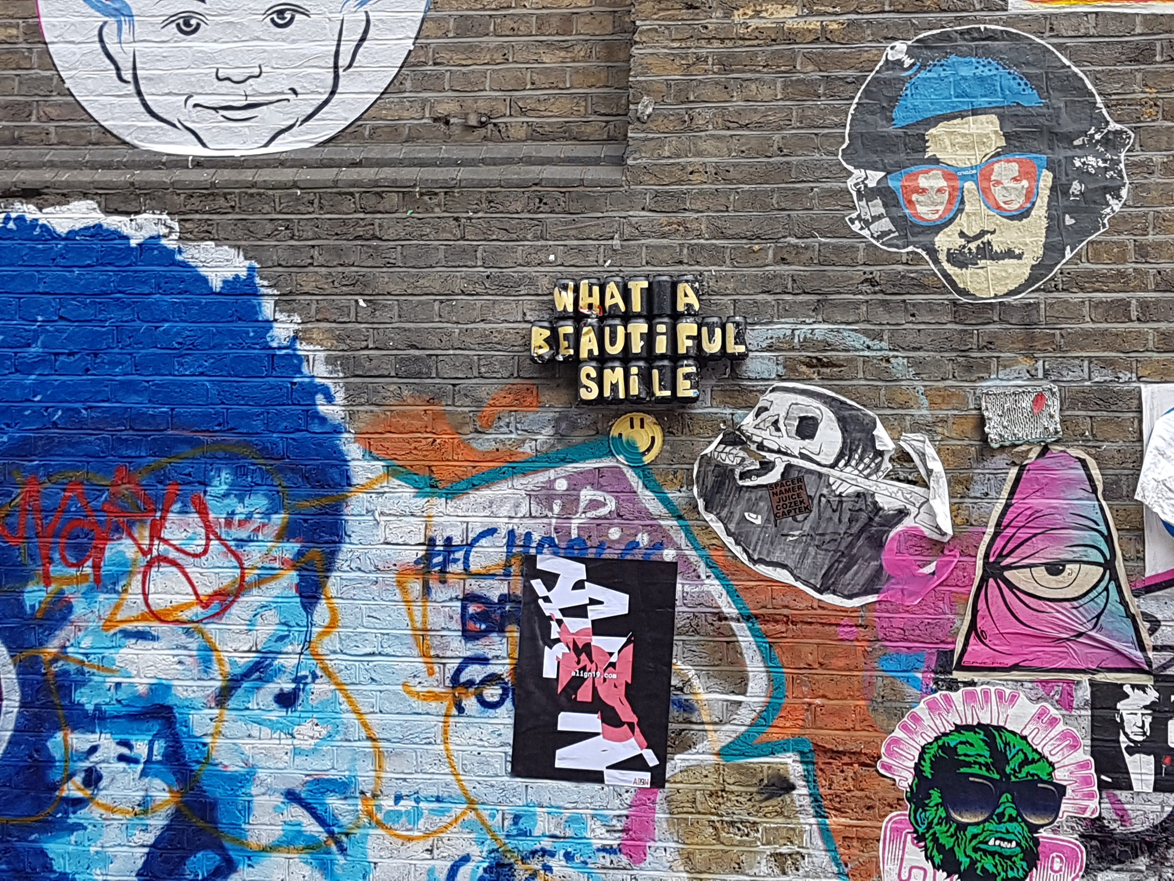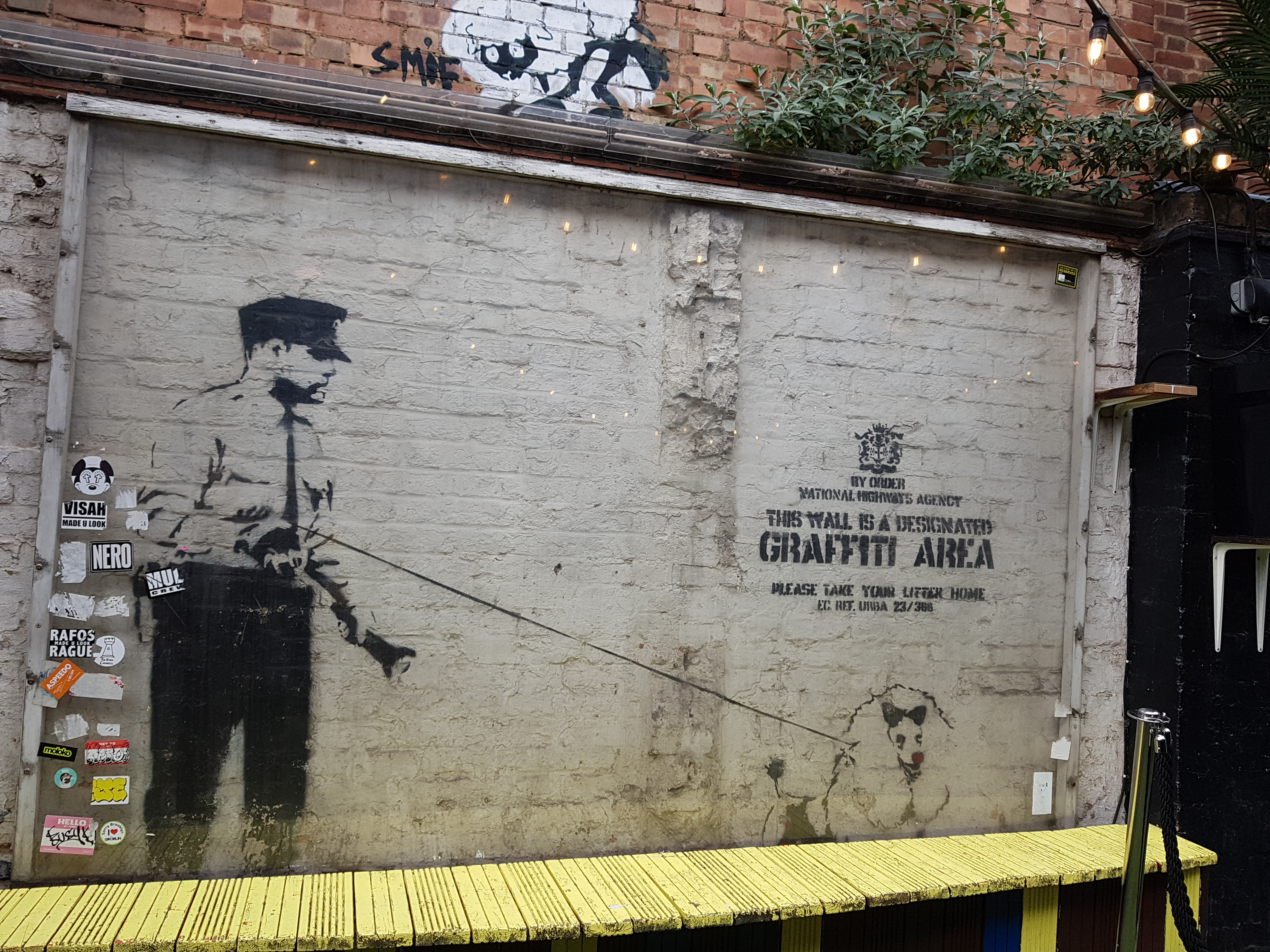 Starting with a couple of Banksy pieces, each with a protective transparent plastic cover, we journey past political statement stencils, huge collaborative collages, the odd mushroom sculpture positioned atop of buildings, tin can art and plenty more social commentary – from Trump and Brexit, to the developers set on changing the area for good.