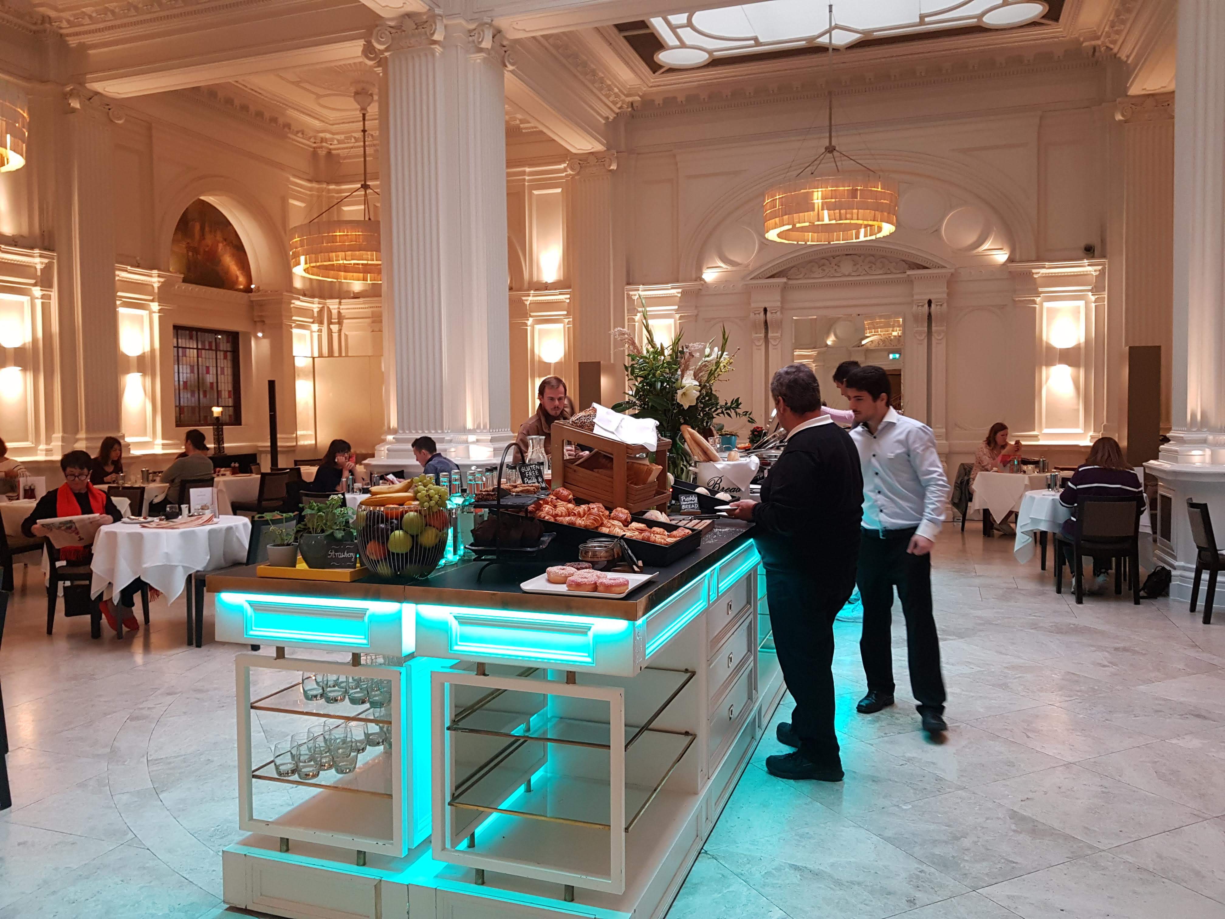 A buffet table forms a centrepiece in the middle, laden with hot and cold breakfast items, pastries, breads, fruit, juices, cereal and more. A team of staff expertly circulate, greeting guests and pouring hot coffee from shiny silver pots. The only regret is not having more time to indulge, but what comes next is not to be missed.