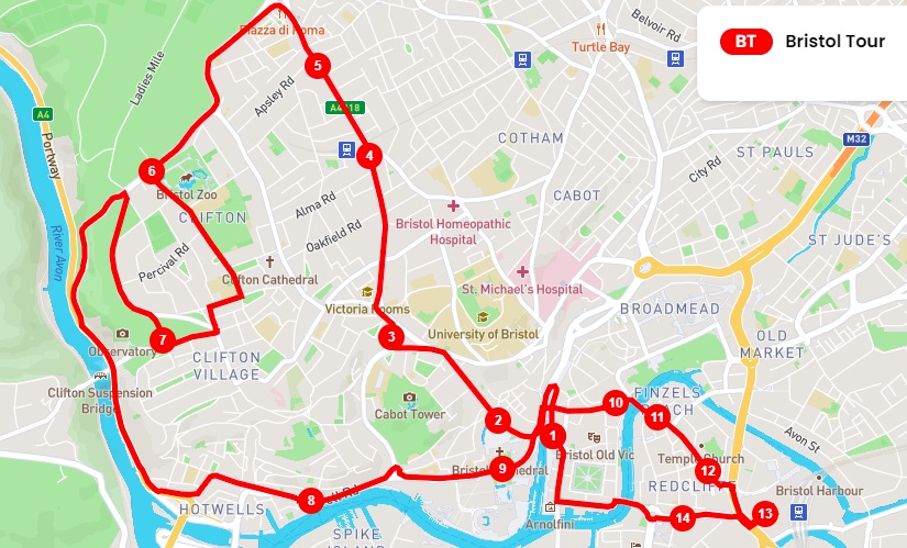 The Tootbus tour starts at the centre on Broad Quay before heading to College Green, up Park Street, through Clifton Village, past Bristol Zoo and down Bridge Valley Road to head underneath the Suspension Bridge.
