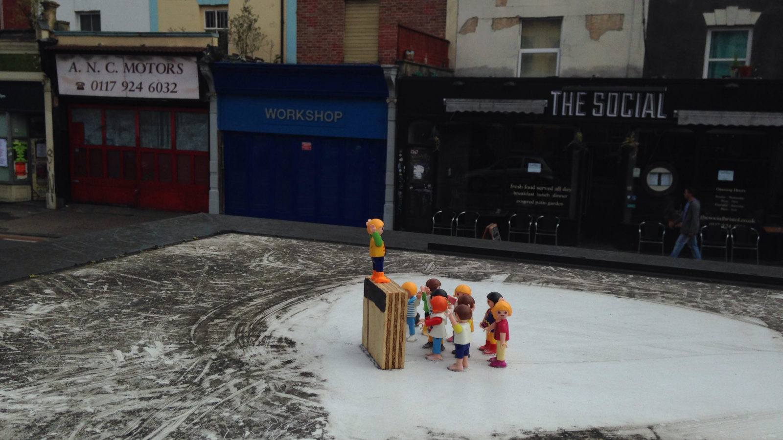 Bus journeys are being brightened up in Bristol by an anonymous artist whose Playmobil figures stretch from Stokes Croft to the Memorial Stadium.