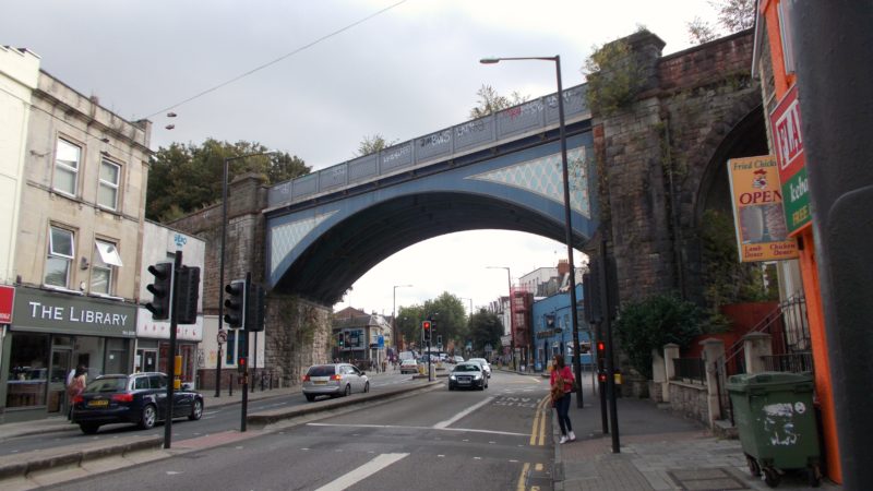 ix. The section of Cheltenham Road known as The Arches is named for the nine-arch viaduct, built in 1873, which carries the Severn Beach line over the passing traffic. Trams used to pass serenely beneath it and for many years it was used as an advertising hoarding for Georges Brewery, based across the river from Castle Park.