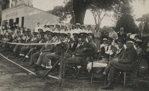 Patients from Beaufort War Hospital in Stapleton, later Glenside Hospital, visiting Downend Cricket Club some time between 1914 and 1918 43207/9/50/28