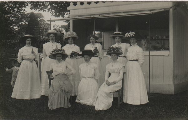 Women of Downend wearing brilliant flowery hats, 1910 43207/37/4/2/5