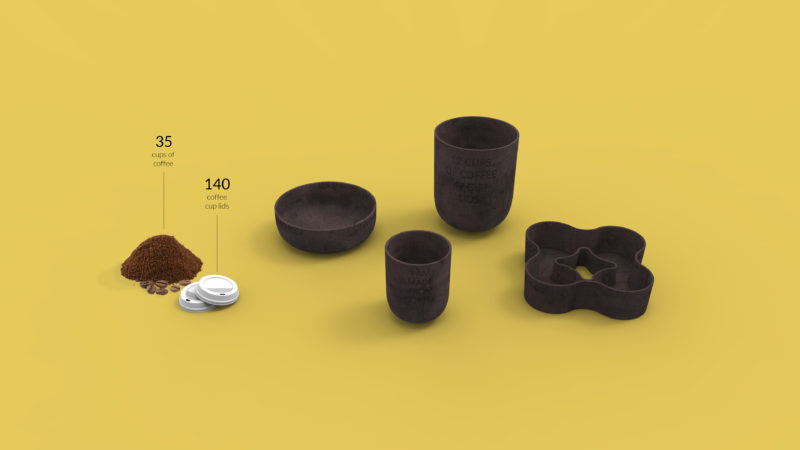For Megan’s product, It Has Bean, she began by creating a coffee composite material from waste coffee grounds and waste plastic coffee cup lids, and from this material she then created a series of products which are for use in a café.