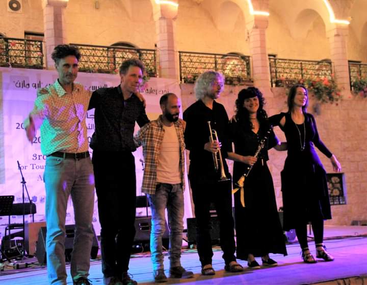 David, third from right, played trumpet at the Nablus Music Festival in the West Bank with the Chai For All ensemble. Photo supplied by David Mowat.