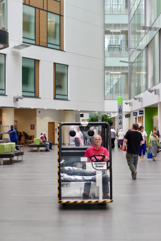 “It’s a very pleasant ride, you get a nice little breeze!” Graham says as we roll through the hospital, slowing for the melee of people who stride purposefully across the space or wander slowly, some hindered by crutches. “You just have to be patient. We have the beeping noise, but people don’t always notice the buggy coming. If someone is in front of us, we just wait.”