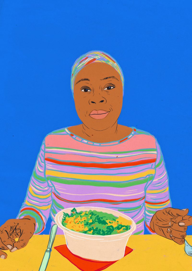 LaToyah with her baked salmon breakfast at Napolita – Illustrated by Anna Higgie