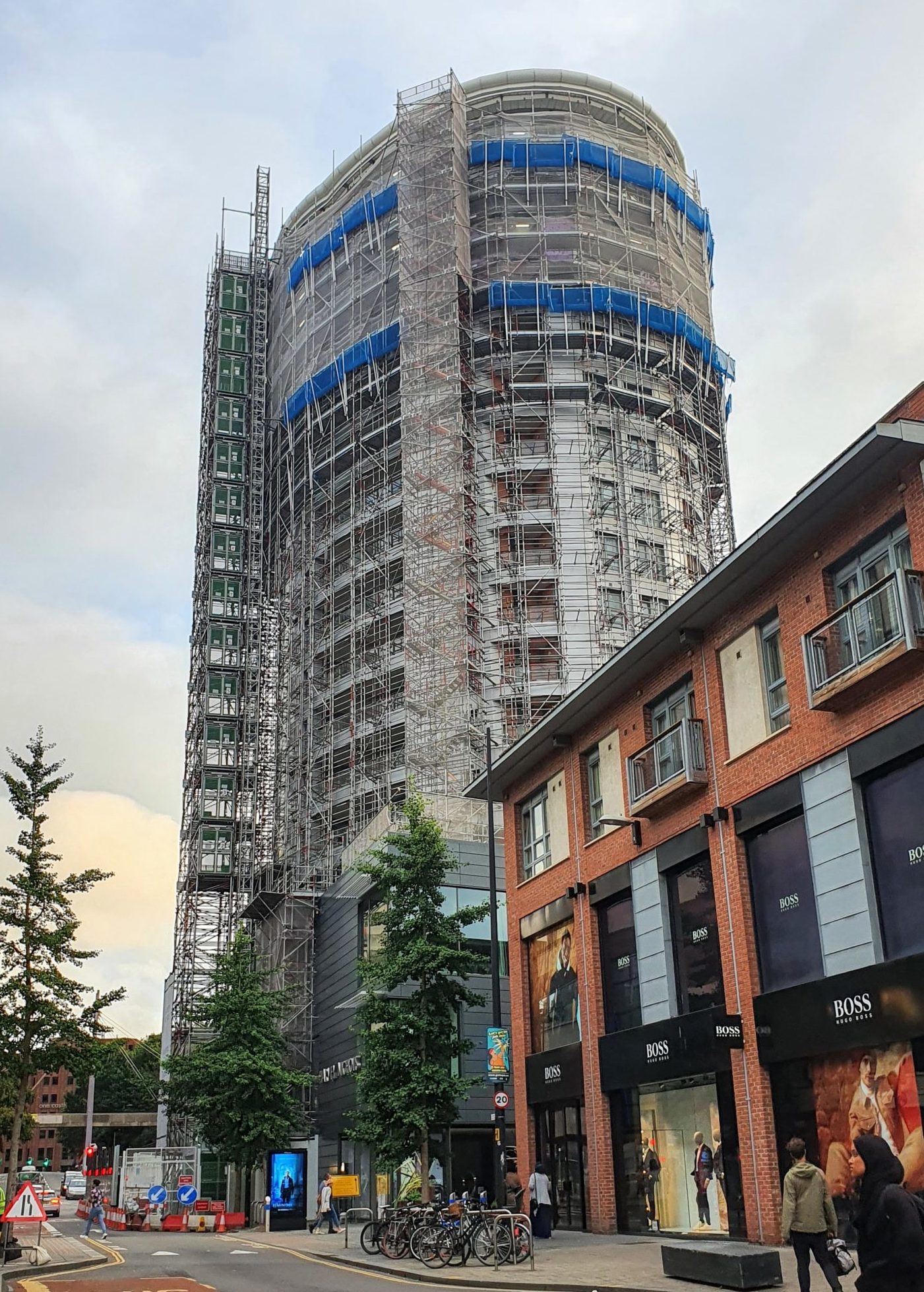 One of the most prominent privately-owned tower blocks in the city centre, above Harvey Nichols, has been shrouded in scaffolding for months while combustible material is removed.