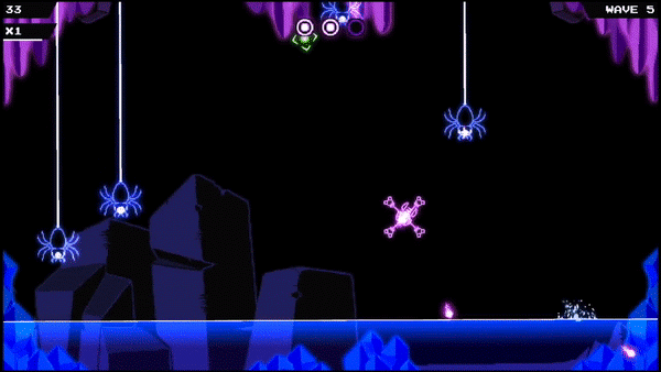 Ashley Gwinnell’s game, Neon Caves, sees players try to build a high-score by sharpshooting through wave-after-wave of creepy enemies – all while a cave is rapidly crumbling overhead.