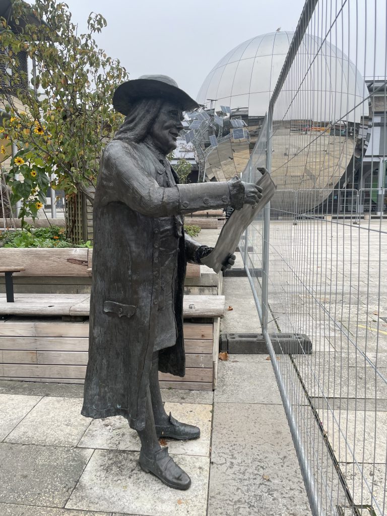 The smaller sculpture of William Penn on Millennium Square is by artist Lawrence Holofcener and is part of a trio commissioned for the opening of the square in 2000 which also includes Bible translator William Tyndale and poet Thomas Chatterton.