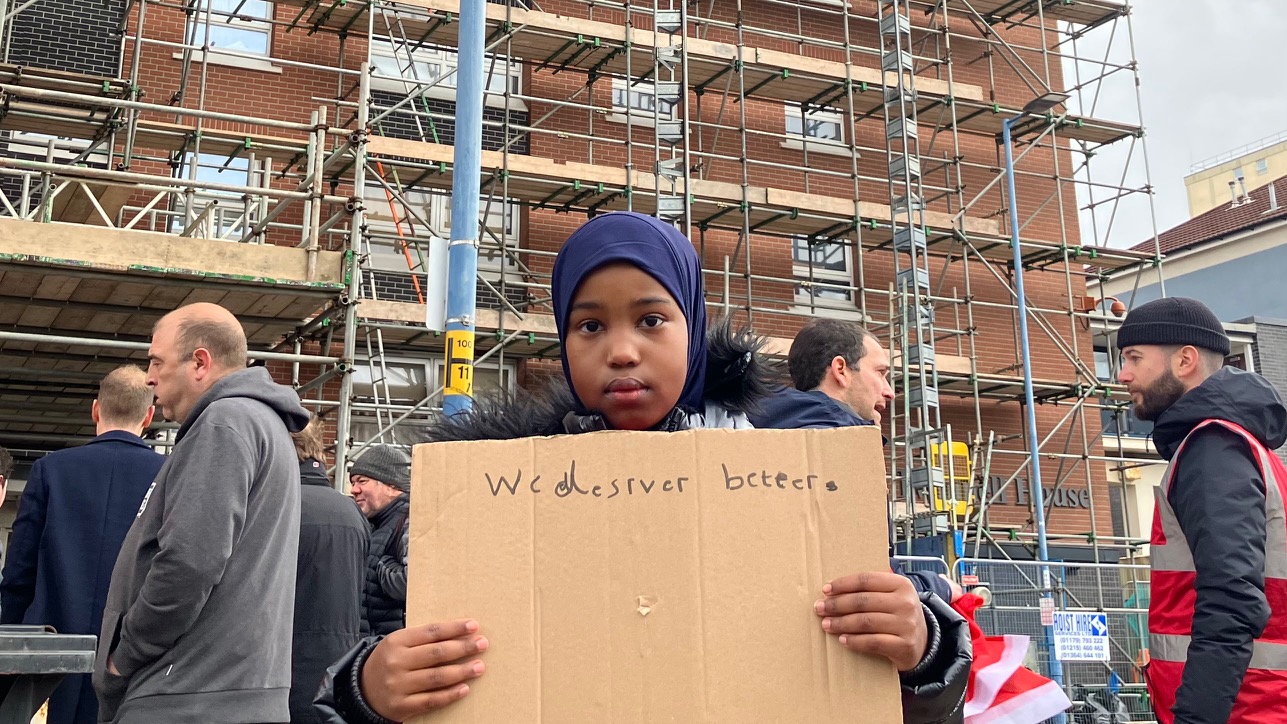 Ten-year-old Ruweyda Khalid standing outside Twinnell House in Barton Hill where a man died after falling from the 16th floor – photo Rachel Sutherland
