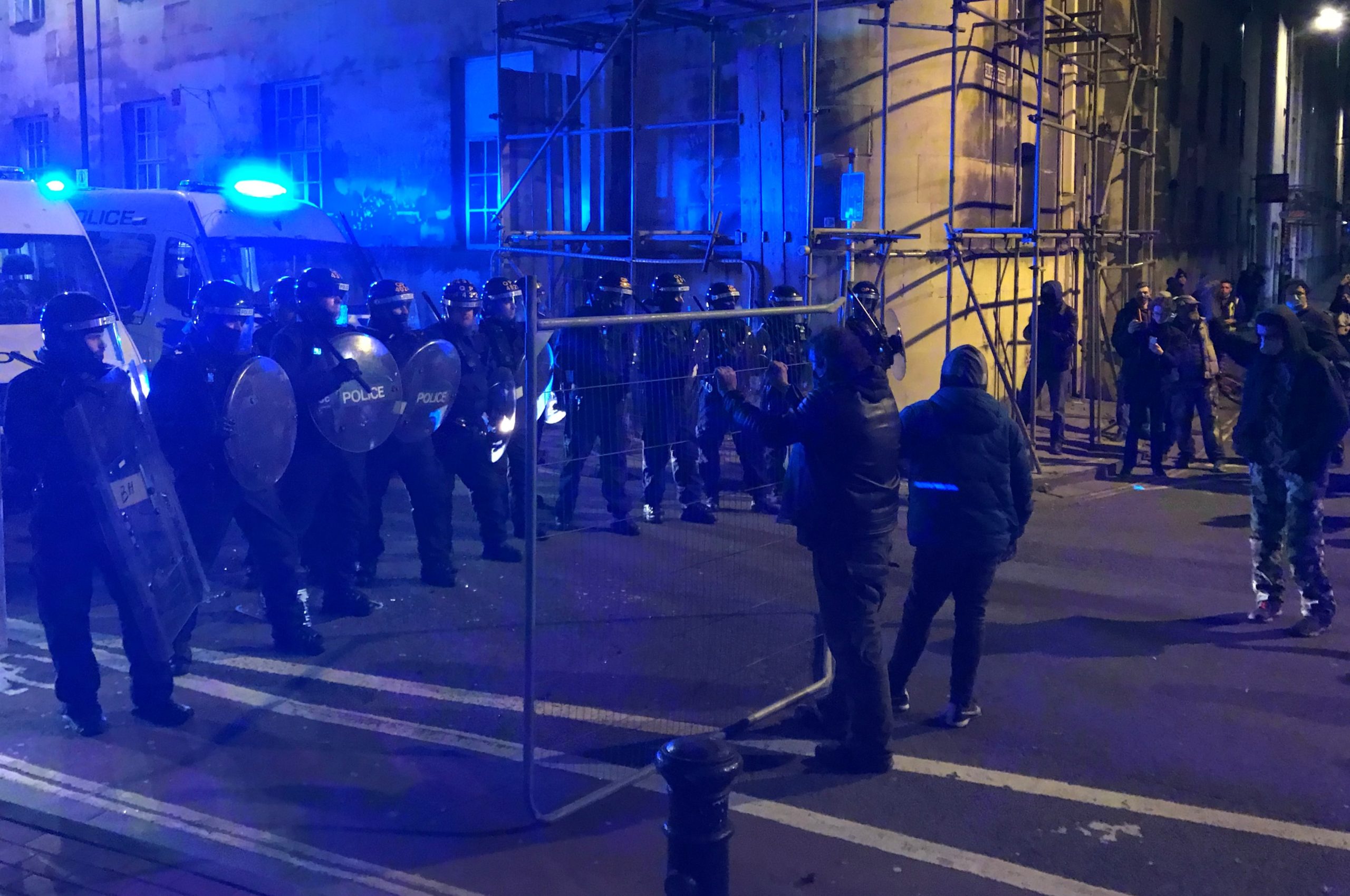 Some of the ugliest scenes from an evening of violence came on Nelson Street, where rioters removed some of the Heras fencing protecting the scaffolding around The Station and used it as improvised weapons.
