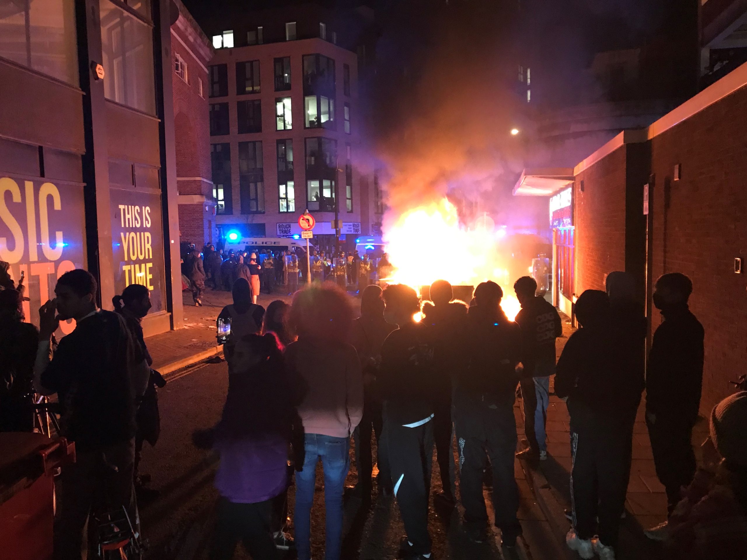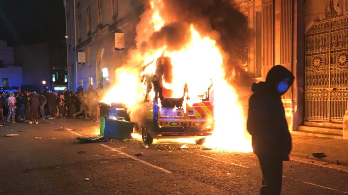 As one police car was burning on the corner of All Saints Street and Nelson Street, the crowd watched on, seemingly transfixed.