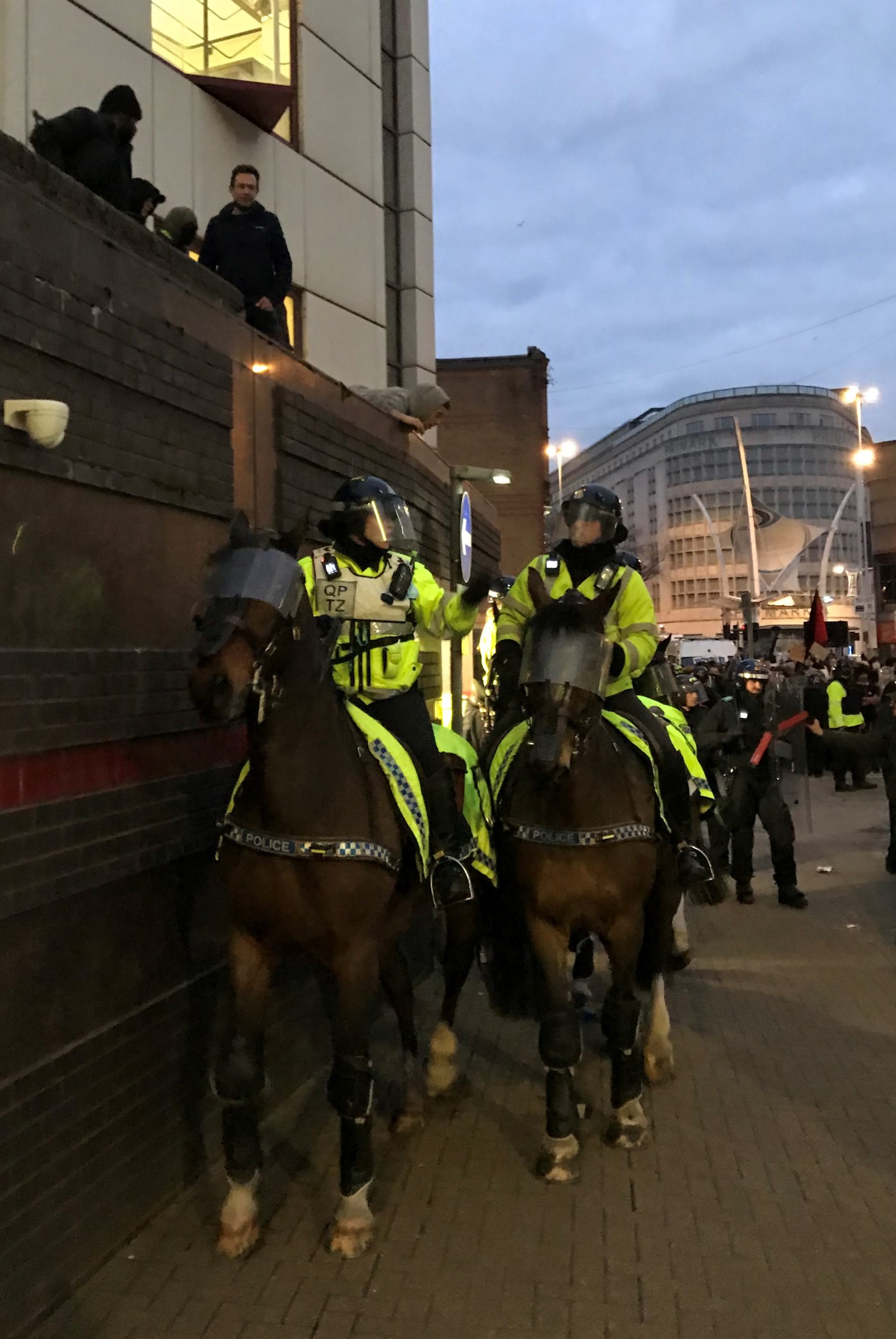 Police initially formed two lines facing in opposite directions, with four horses facing the larger group of protesters on the Primark side of Rupert Street.