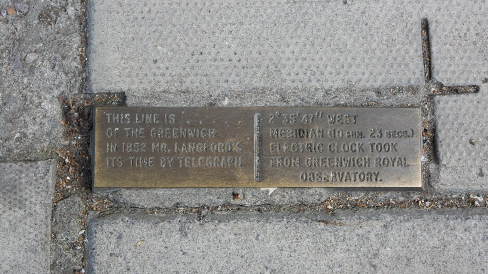 Engraved on the metal plaque are the words: ‘This line is 2° 35′ 47″ west of the Greenwich Meridian (10 min. 23 secs.). In 1852, Mr Langford’s electric clock took its time by telegraph from the Greenwich Royal Observatory.’