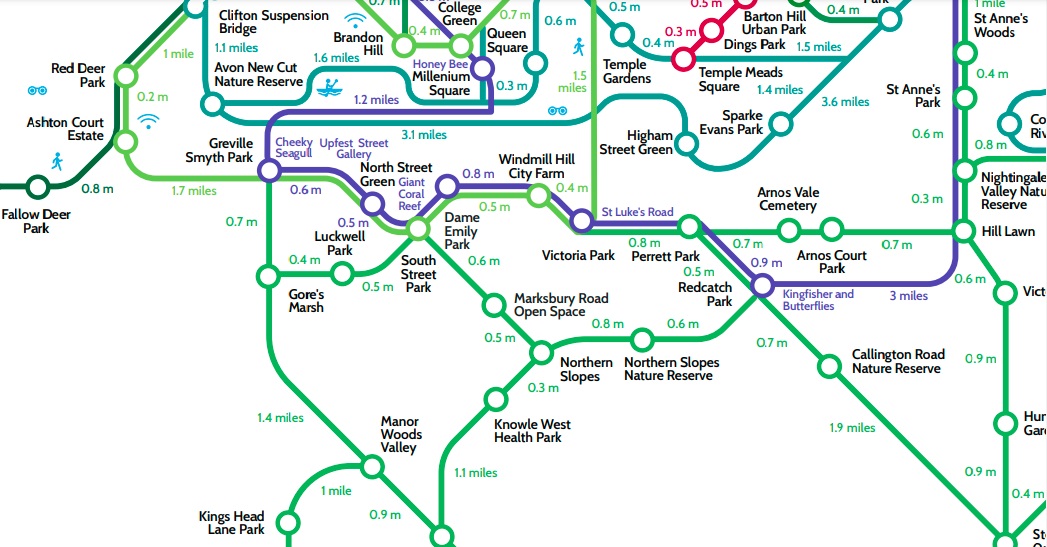 A new map inspired by Harry Beck’s famous map of the London Underground features ten ‘lines’ and some 250 green places to explore across Bristol. The ‘Greenground Map’ by graphic designer Helen Ilus aims to connect the city’s parks and open spaces to inspire walks, runs and bike rides. Helen lives in Tallinn, the capital of Estonia, but graduated from UWE Bristol with a degree in animation. The map of Bristol is her third Greenground Map following versions of London and Edinburgh.
