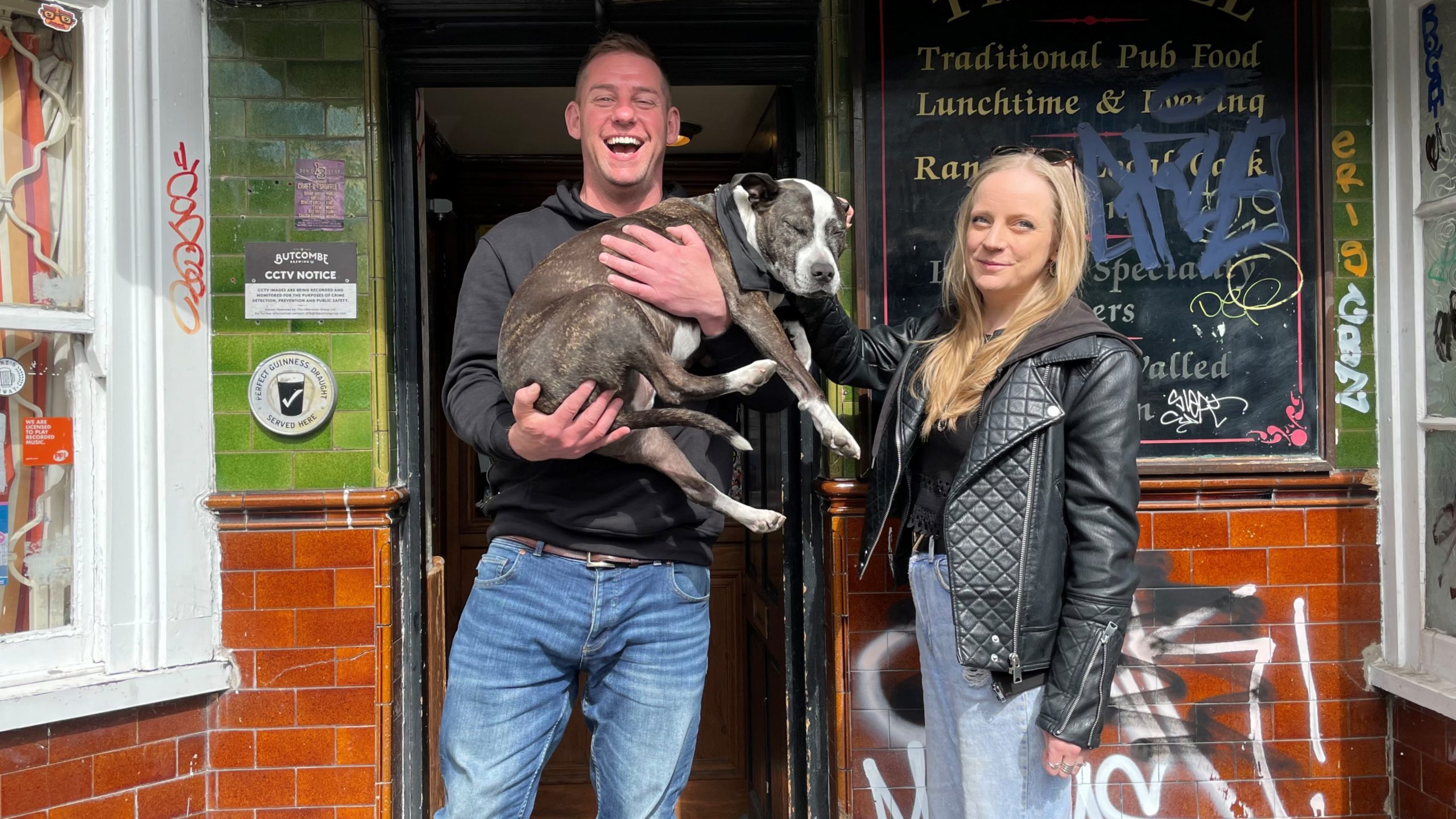 Owner Sam Gregory, landlady Olivia Ramsey and pub dog Charlie outside the Bell – photo: Martin Booth