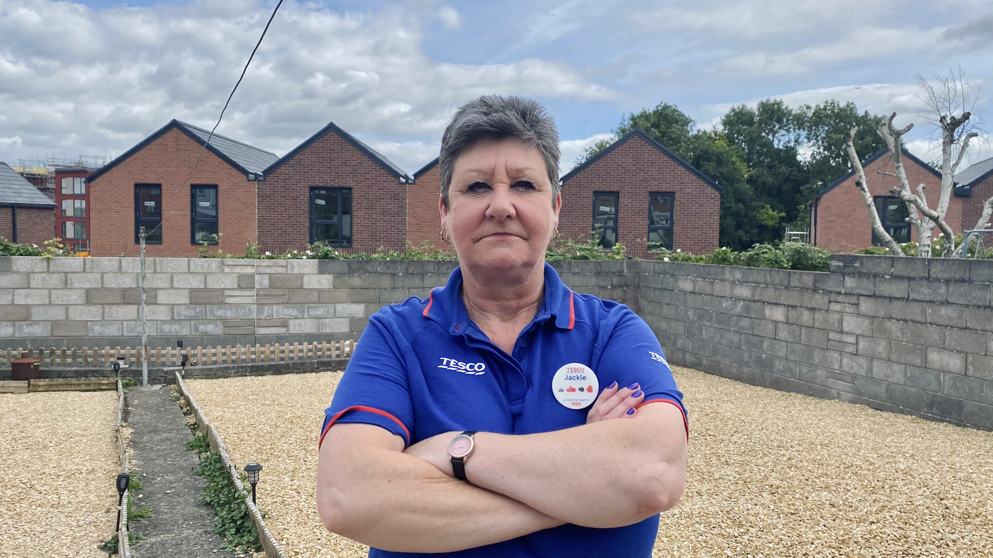 Jackie Bowley in front of four houses built overlooking her garden by developer BoKlok – photo: Charlie Watts