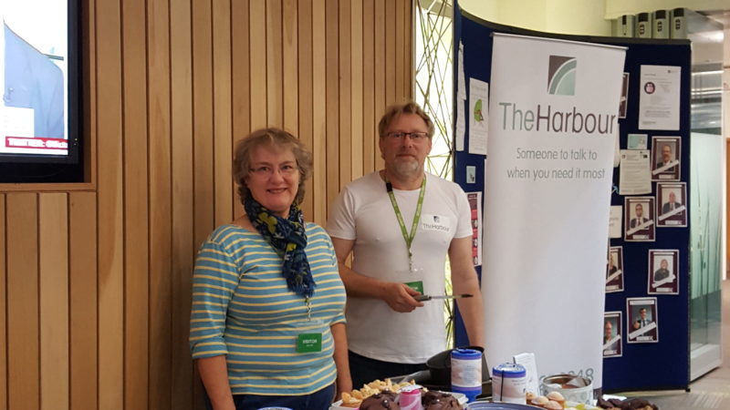 Volunteers Colin and Linda manning a cake stall, raising money for The Harbour