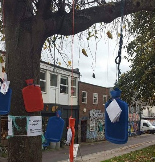 Inspired by an initiative in Brighton, where hot water bottles hang from trees to be claimed by homeless people, the Hot Water Bottle Network aims to keep people warm through the winter.