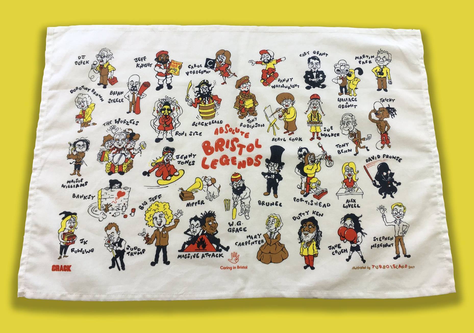 Born from a late night pub discussion between the two founders of Crack Magazine, the Absolute Bristol Legends tea towel immortalises 34 well-known Bristol figures, and is being sold for charity.