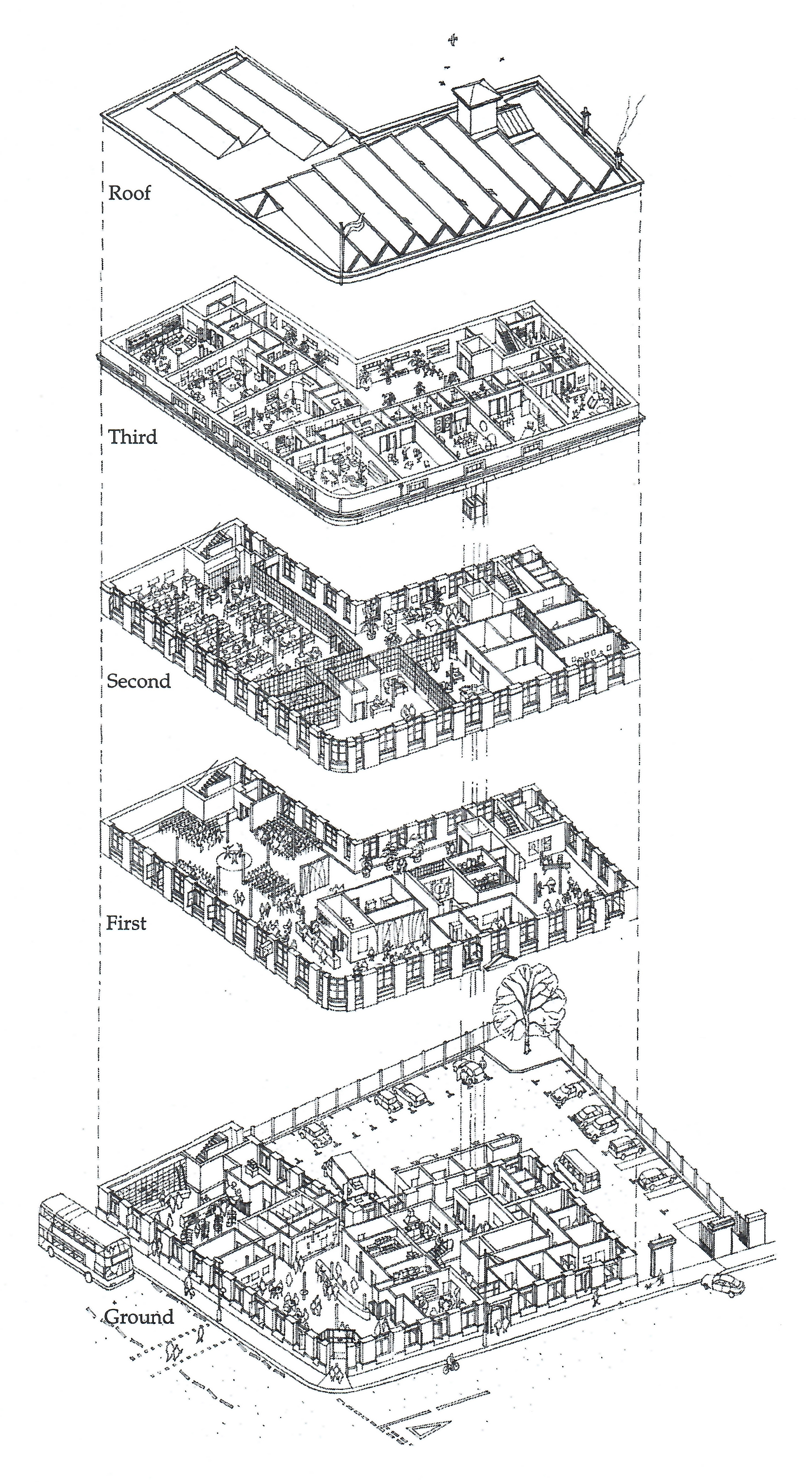 “It still angers me that this is only five per cent of what was on this big estate. There was the best part of a million square feet. This building is under 50,000 square feet. It was a huge loss. I did a sketch scheme at the late end of the 80s to turn the whole estate into a sort of creative urban village. But I couldn’t get them listed, I couldn’t get planners to protect them. And there was a planning application to knock the whole lot down and turn it into a housing estate. I thought, well maybe I could use this site as a lever to try and save the rest. But by that time they had started the demolition. I couldn’t get anything from the bank or anything like that. And so I said yes before I knew how I was going to get the money, because I knew this was a fantastic opportunity to do something interesting, more interesting than I would normally do as an architect for clients who would turn it into flats or a block of offices or something. This one became the last one to be knocked down. What I thought was interesting about it is that it was potentially part of the high street while the others weren’t – and they were bigger and I couldn’t possibly have afforded the others. What I later discovered is that my £200,000 had paid the fees of the receiver and the agents, so they accepted the money really quickly.”