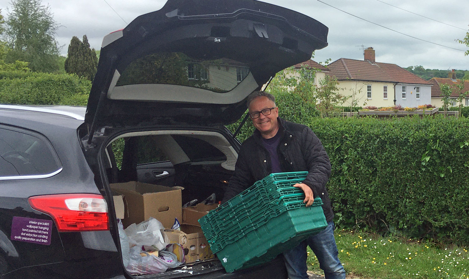 Cafe regular Dave Mallard loads his car with donations from the community for the local foodbank. Photo by Mary Milton