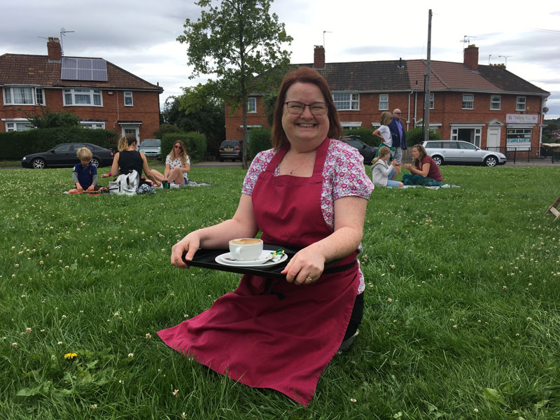 Within ten minutes of opening, the small number of outdoor tables are taken by older people, while younger customers sit with their cups on the grass. The joyful sounds of children playing drift over from the recently reopened playpark. Blake, aged six and Gracie, aged four, are with their mum, Heather Keats. Fellow local Matt Ayers is nearby. They say they are all happy to be back at the cafe but that lockdown has not been all bad.
