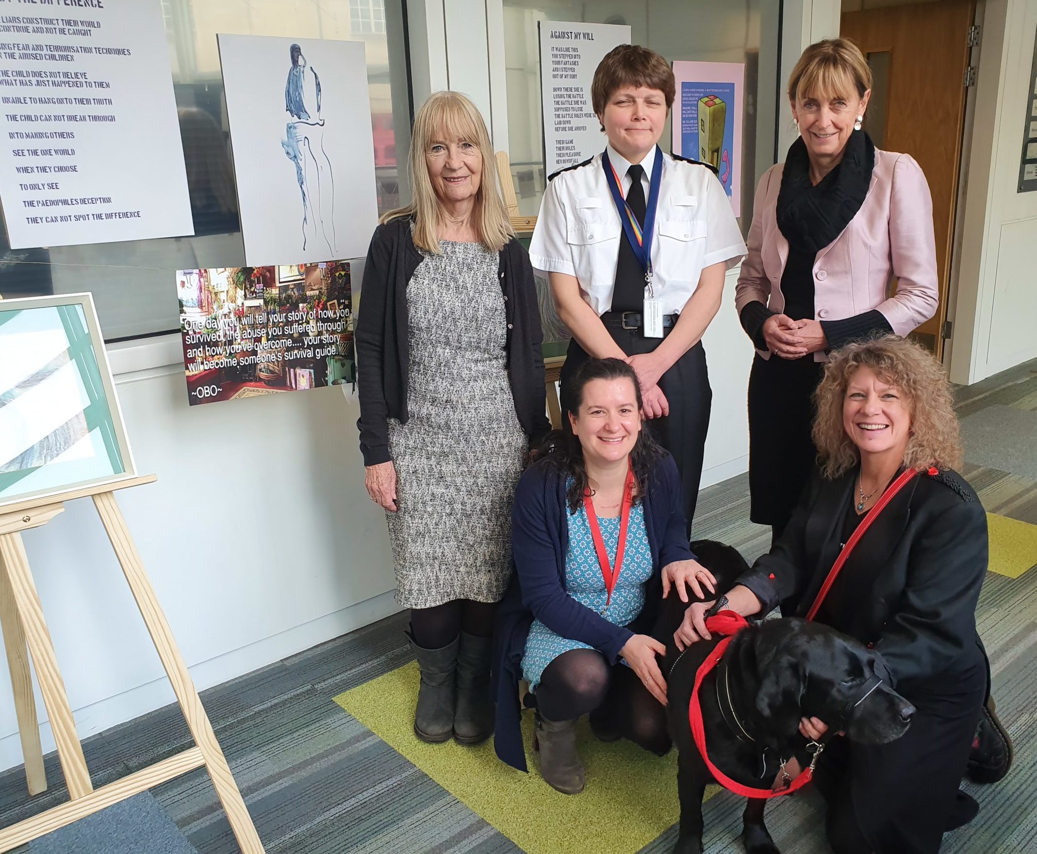Safe Link CEO Carol Metters, deputy chief constable Sarah Crew, PCC Sue Mountstevens, Sarah O’Leary from Safe Link and exhibition contributor Olivia Oxenfree, with dog Bliss. Photo by Ellie Pipe