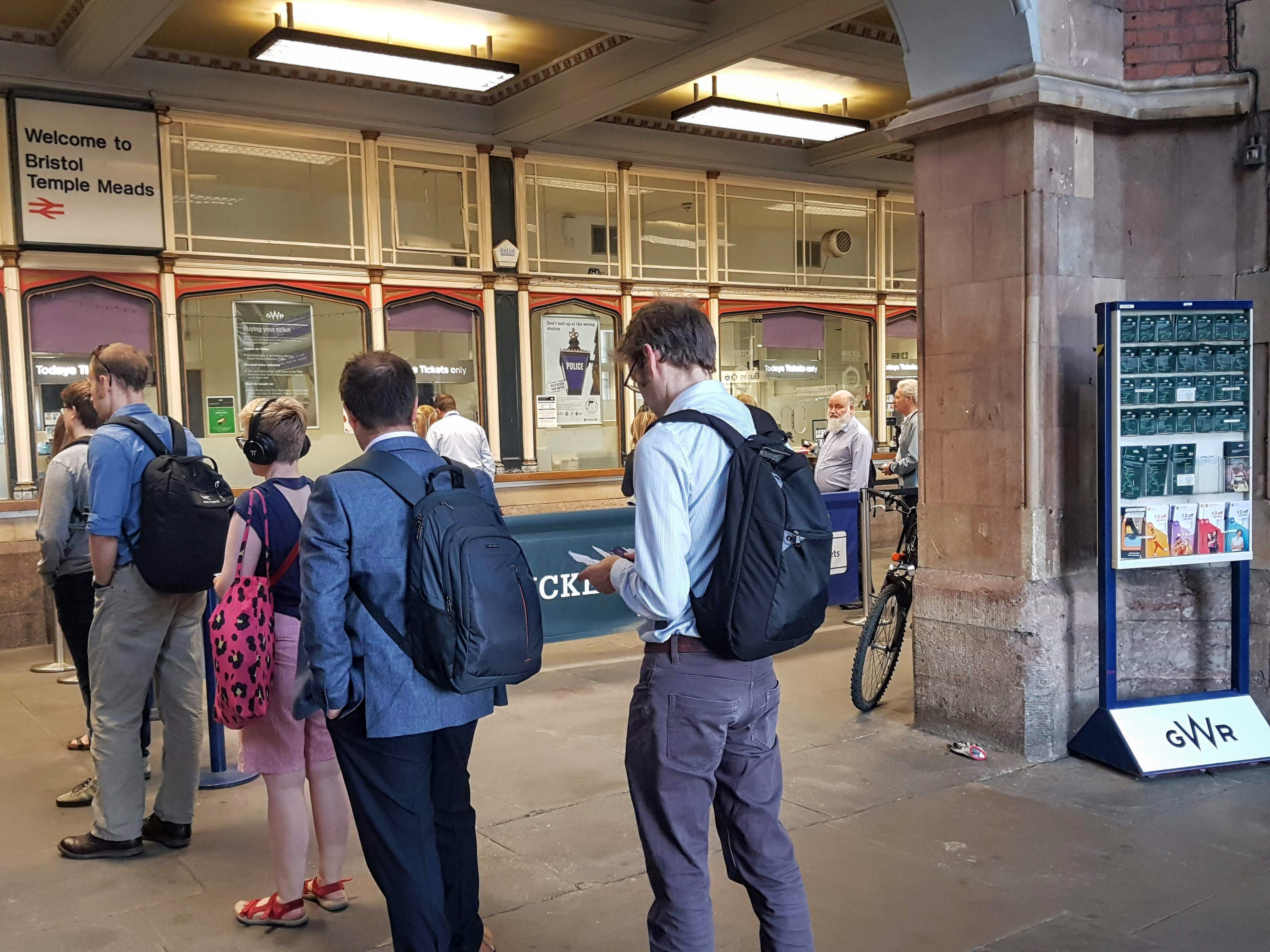 The train pulls in and the dad needs assistance to lift the pushchair up the steep step into the carriage, where it’s standing room only back to Temple Meads. The ticket officer greets new passengers with a cheery smile as she patiently threads her way through the throngs of people in the hot, sweaty carriage to issue and check tickets.
