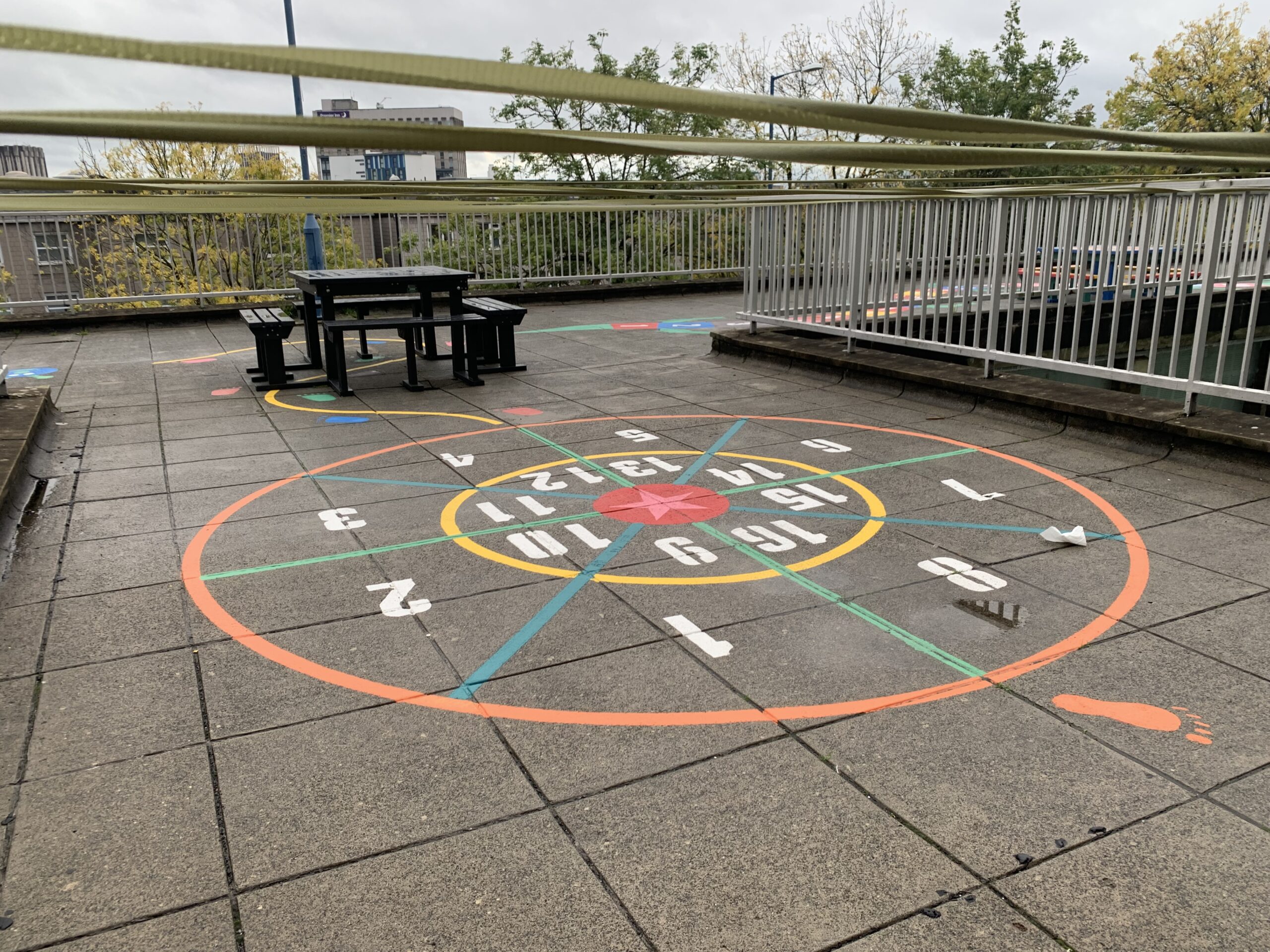 Games like hopscotch, snakes and ladders and a drawing pad are painted across the ground