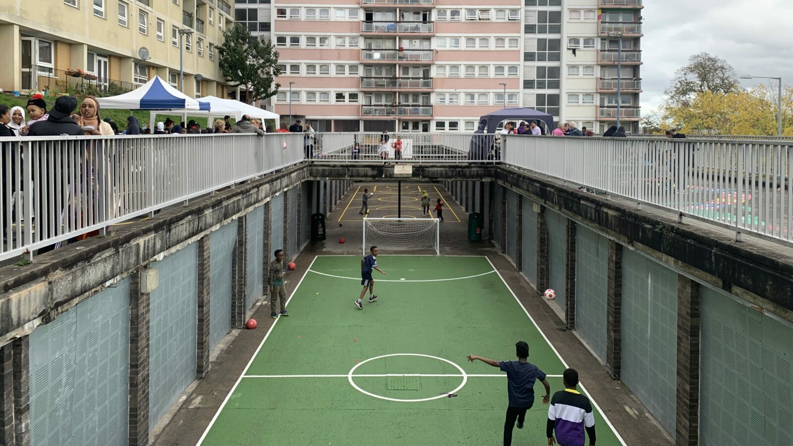 Residents held an initial consultation with children who lived in the flats – it was the children who had the idea to paint a basketball and football court onto a disused garage plot beneath Dove Street tower.