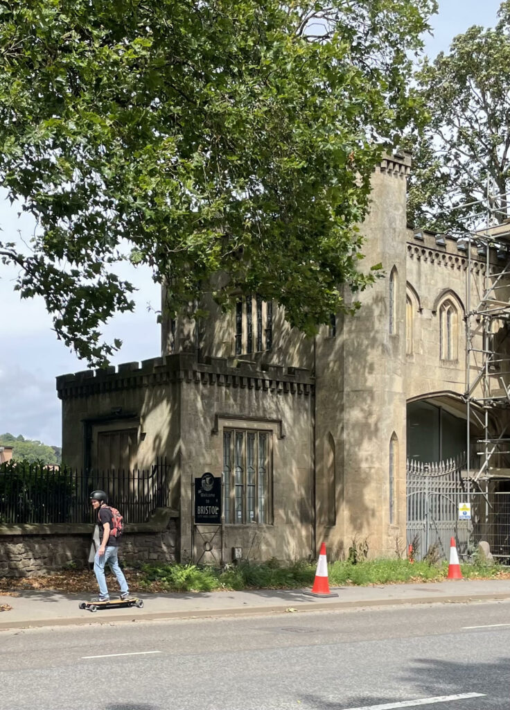 The boundary now heads up the entrance road to Yew Tree Farm – Bristol’s last remaining working farm – before following Colliter’s Brook. Conveniently also following Colliter’s Brook is the new south Bristol link road, with the boundary following Longmoor Brook near the David Lloyd leisure centre before skirting through Ashton Court Estate. From the start of Longmoor Way, the Cabot Tower, Wills Memorial Building, Royal Fort House and the chimney of St Michael’s Hospital are all perfectly aligned.