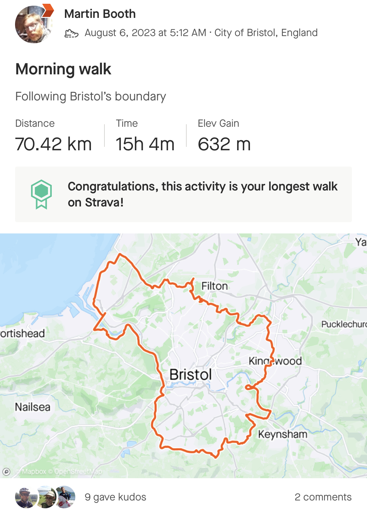 My alignment was Clanage Road to reach the footpath that crosses a bridge over the railway line, where North Somerset becomes Bristol. At 1.45pm, after just over 15 hours of walking, my circumference of our city came to an end with a lie-down on the grass next to the Pill path, today free of bleary-eyed ravers, just bleary-eyed me, ready to hobble home.
