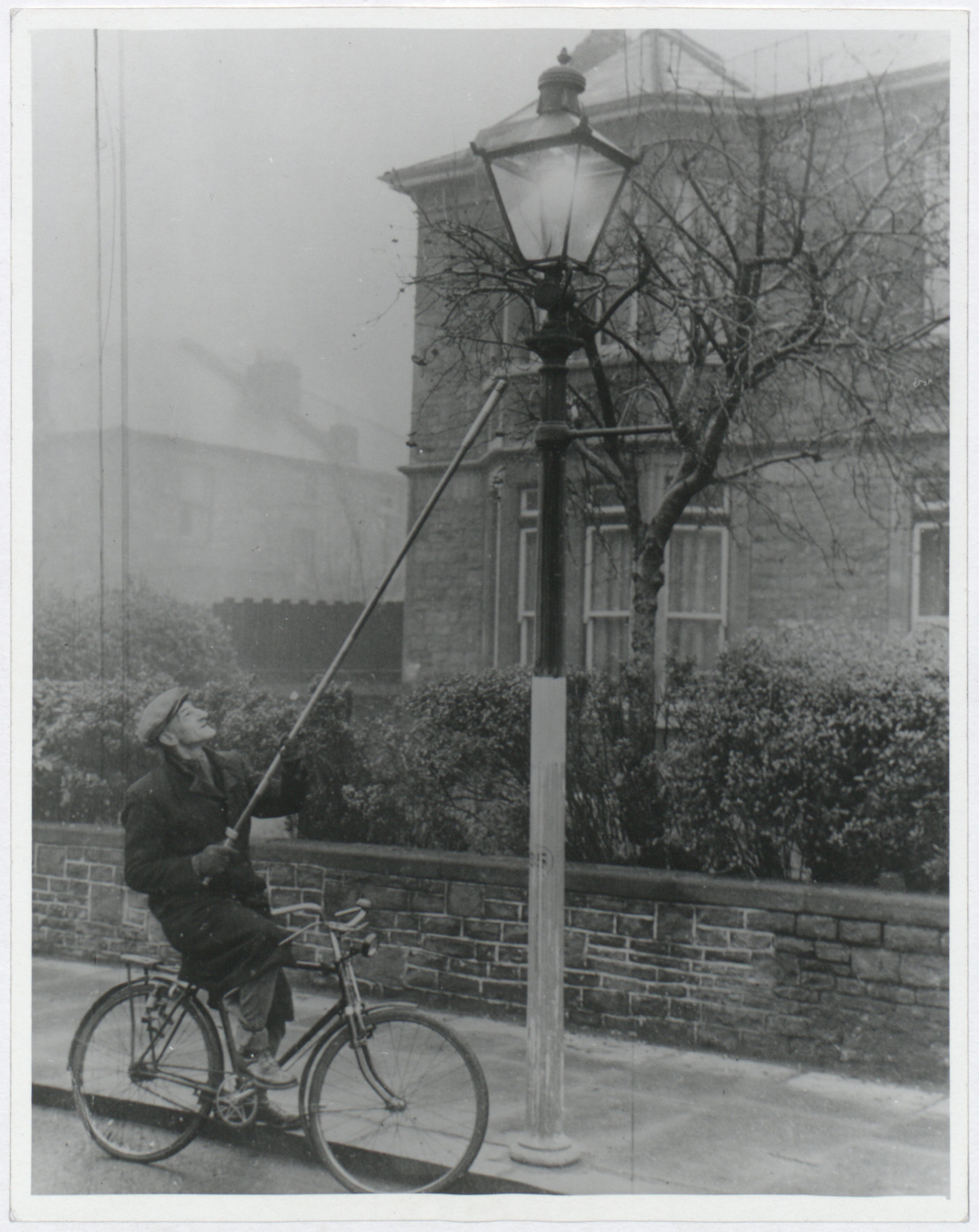 Improved lighting meant that people could work at night, paving the way for the nighttime economy – photo of lamplighter: Bristol Archives collection
