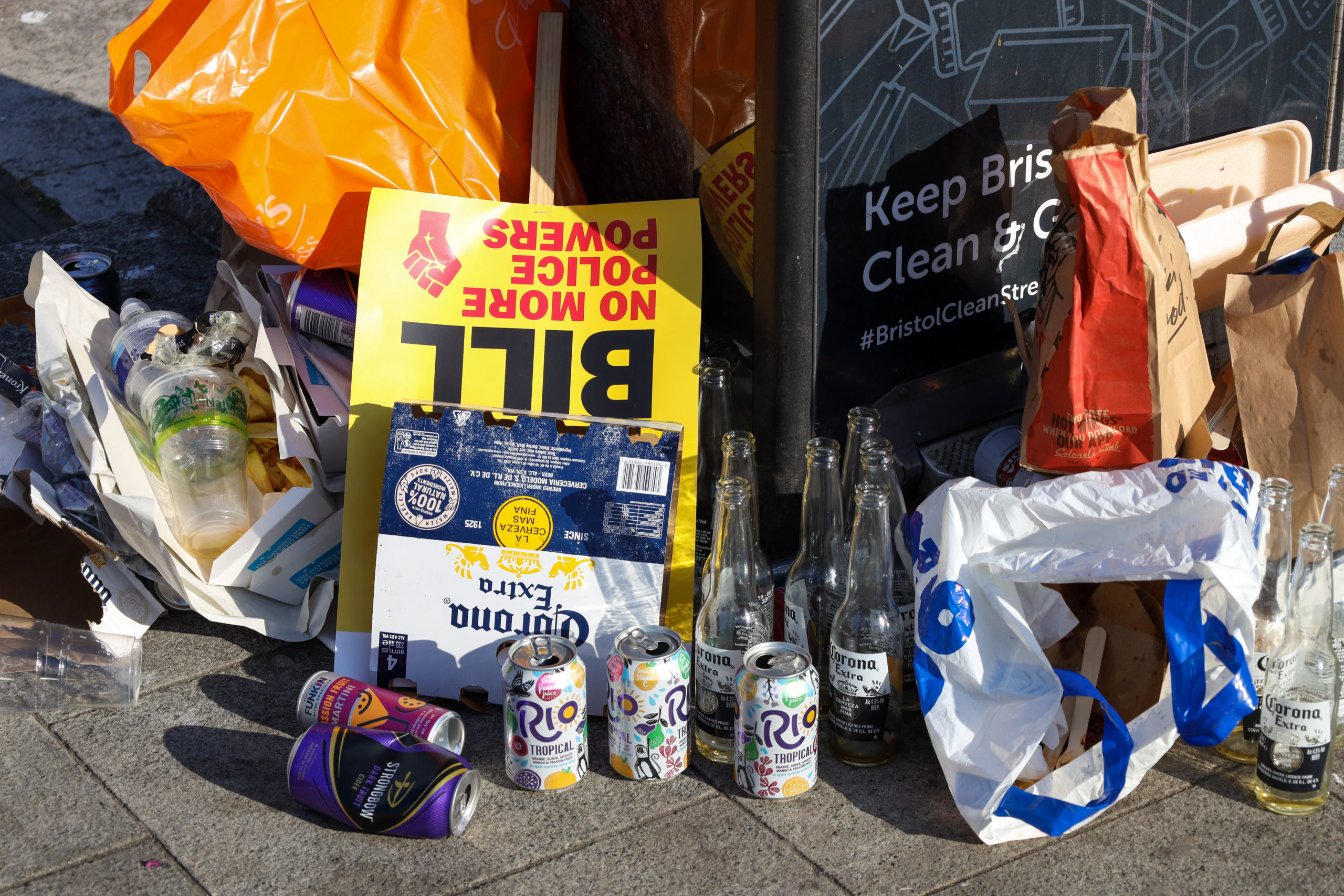 A ‘kill the bill’ placard alongside discarded bottles and cans