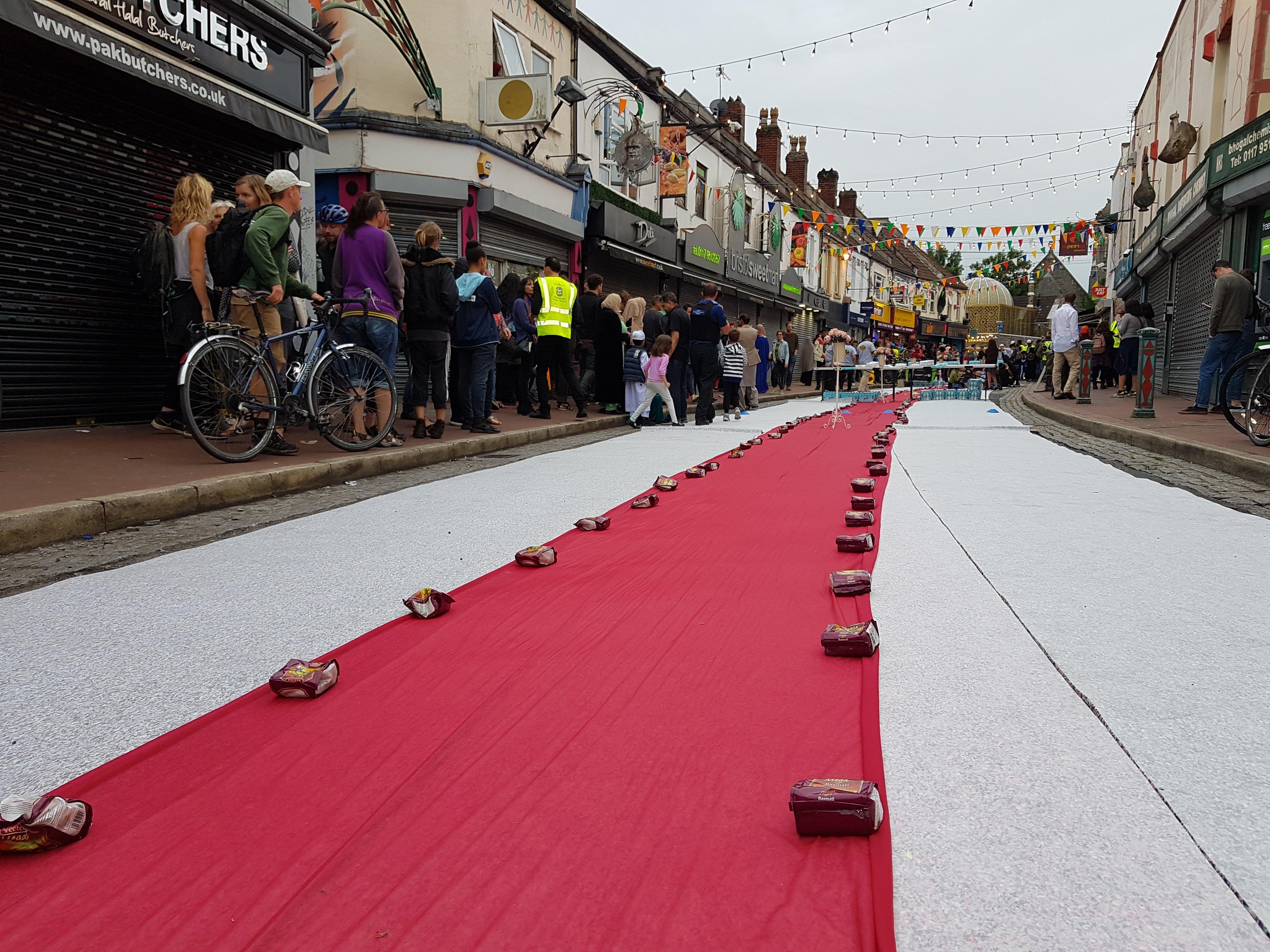 Flags fluttered overhead, as crowds of people of all ages gathered on the carpeted street in an immense show of community spirit for what has been dubbed the city’s biggest ever street party