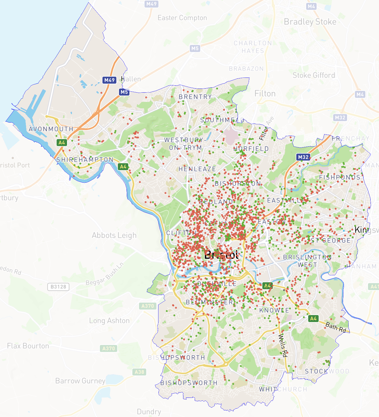A map showing the spread of Airbnbs in Bristol as of November: green dots are ‘entire homes’ and red are ‘private rooms’ – image: Inside Airbnb