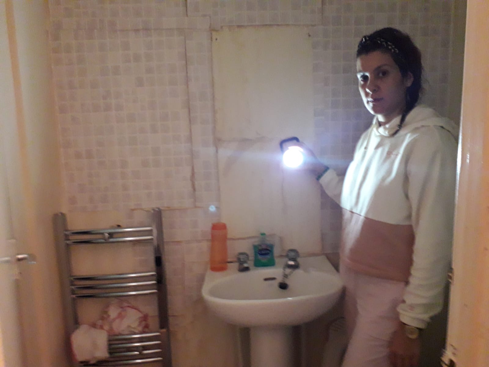 When Alexandra moved into the flat over four years ago when she was pregnant, the electricity was not working so she had to use an extension lead. She still finds that she cannot use the oven at the same time as the washing machine or shower as it causes the electricity to cut out. A leak in the bathroom ceiling, which causes the bathroom light to cut out, has made her scared to use the electric shower. She currently uses buckets of water to wash herself and her son.