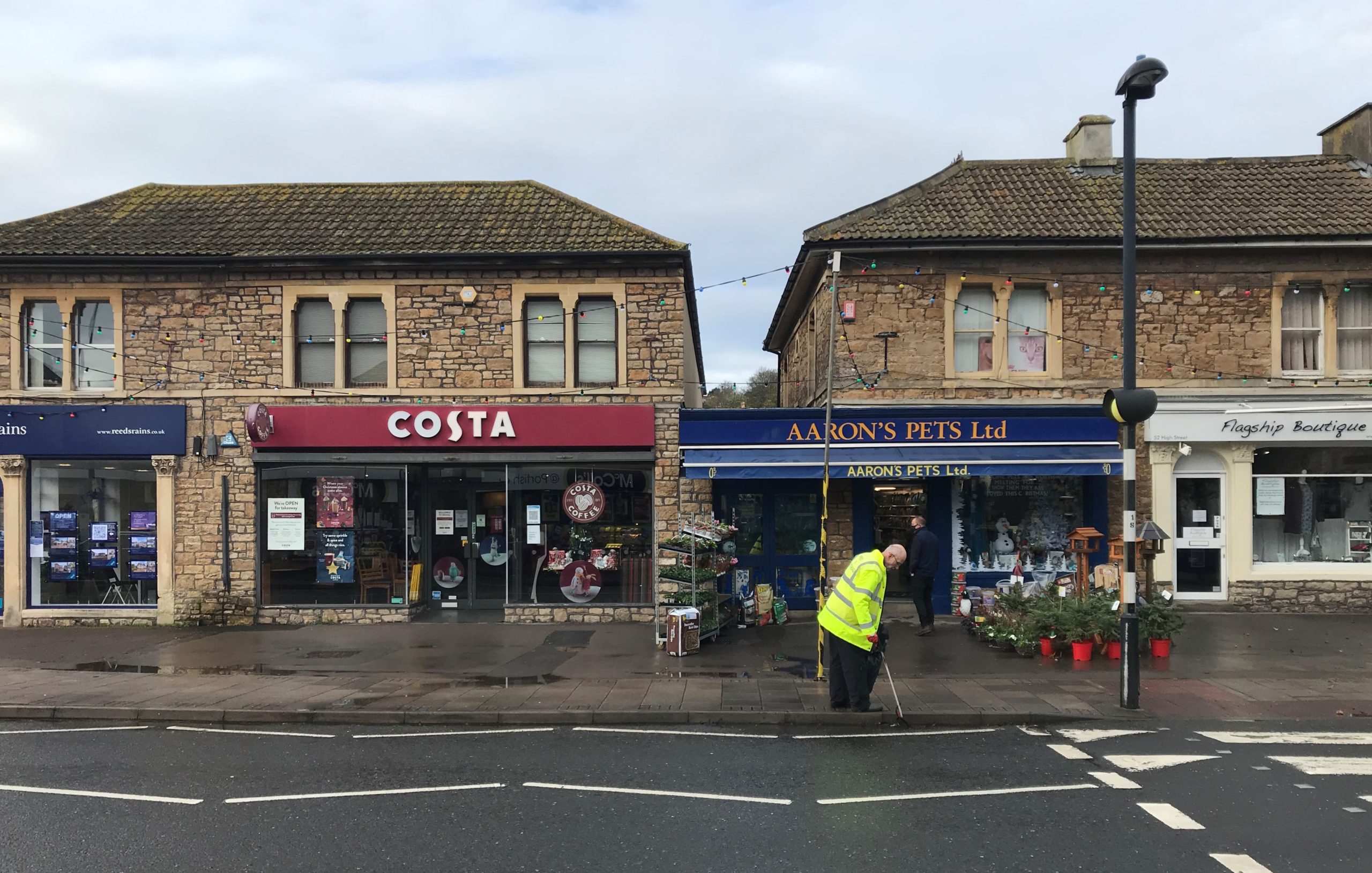 A volunteer in a hi-vis vest from Pride in Portishead – part of the award-winning Portishead in Bloom – picked up litter near Aaron’s Pets, one of the few businesses still open on the High Street.