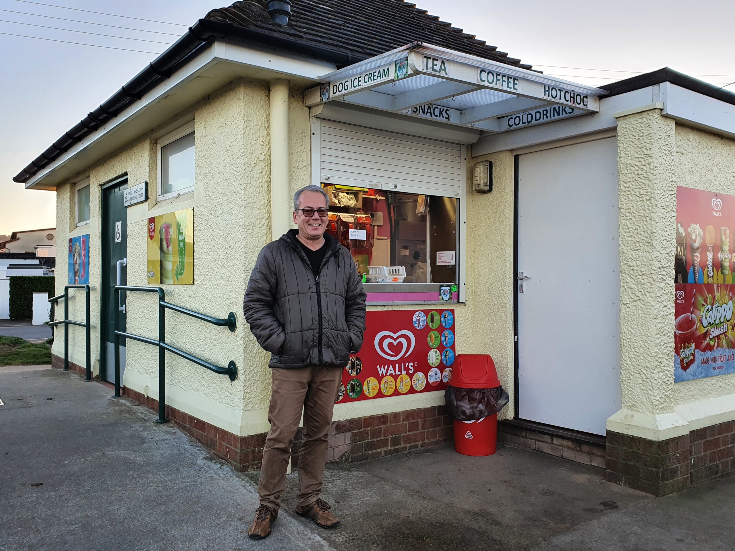 Dave Rosenthal, the owner of Sand Bay Tea Rooms, stands by his kiosk in the car park at Sand Bay
