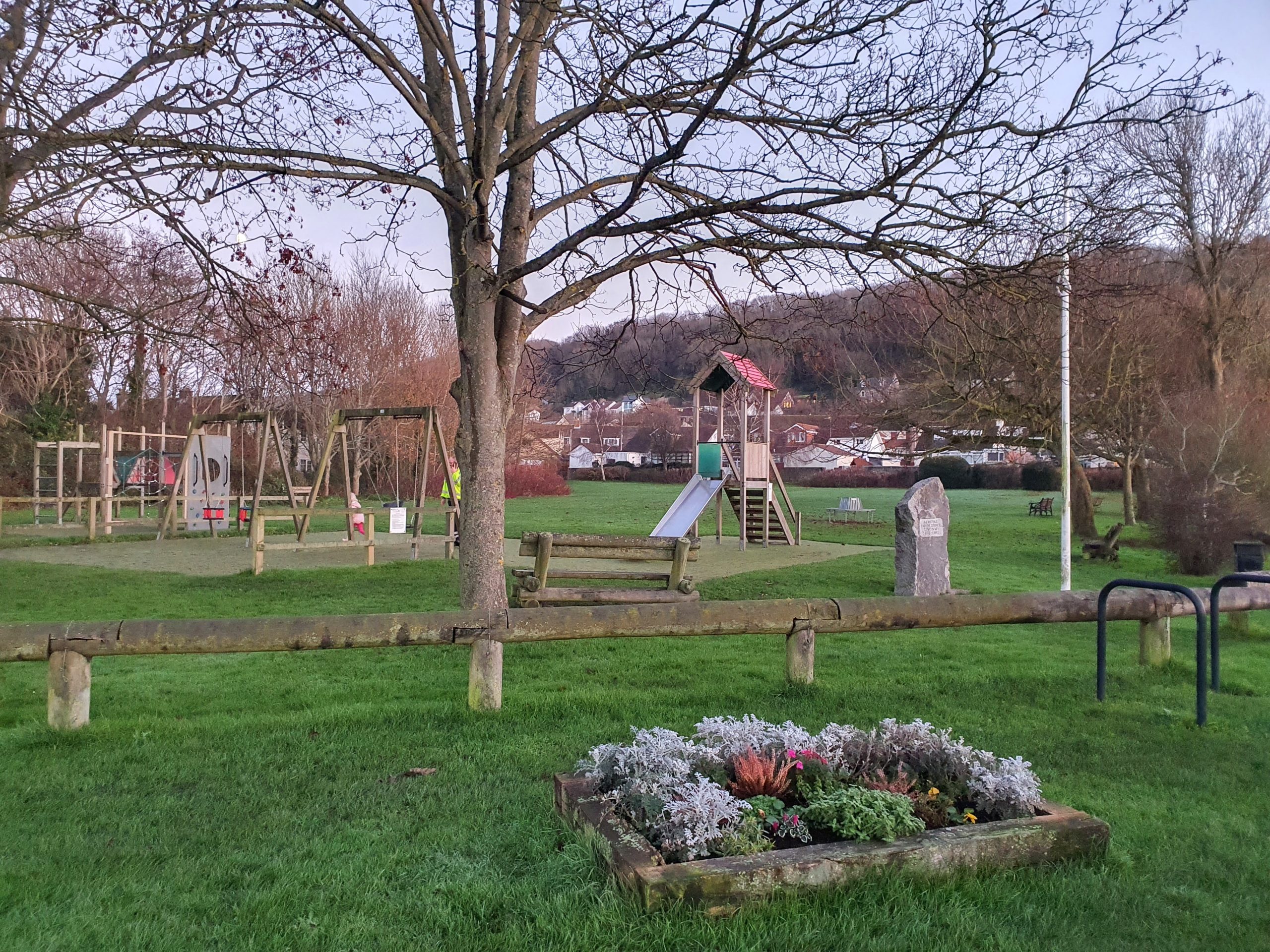 Down the hill, a few children play in the park after school while a horse rider coaxes her reluctant steed past a large van on the corner. Customers pop in and out of the village shop, outside of which a range of fresh fruit and veg is displayed.