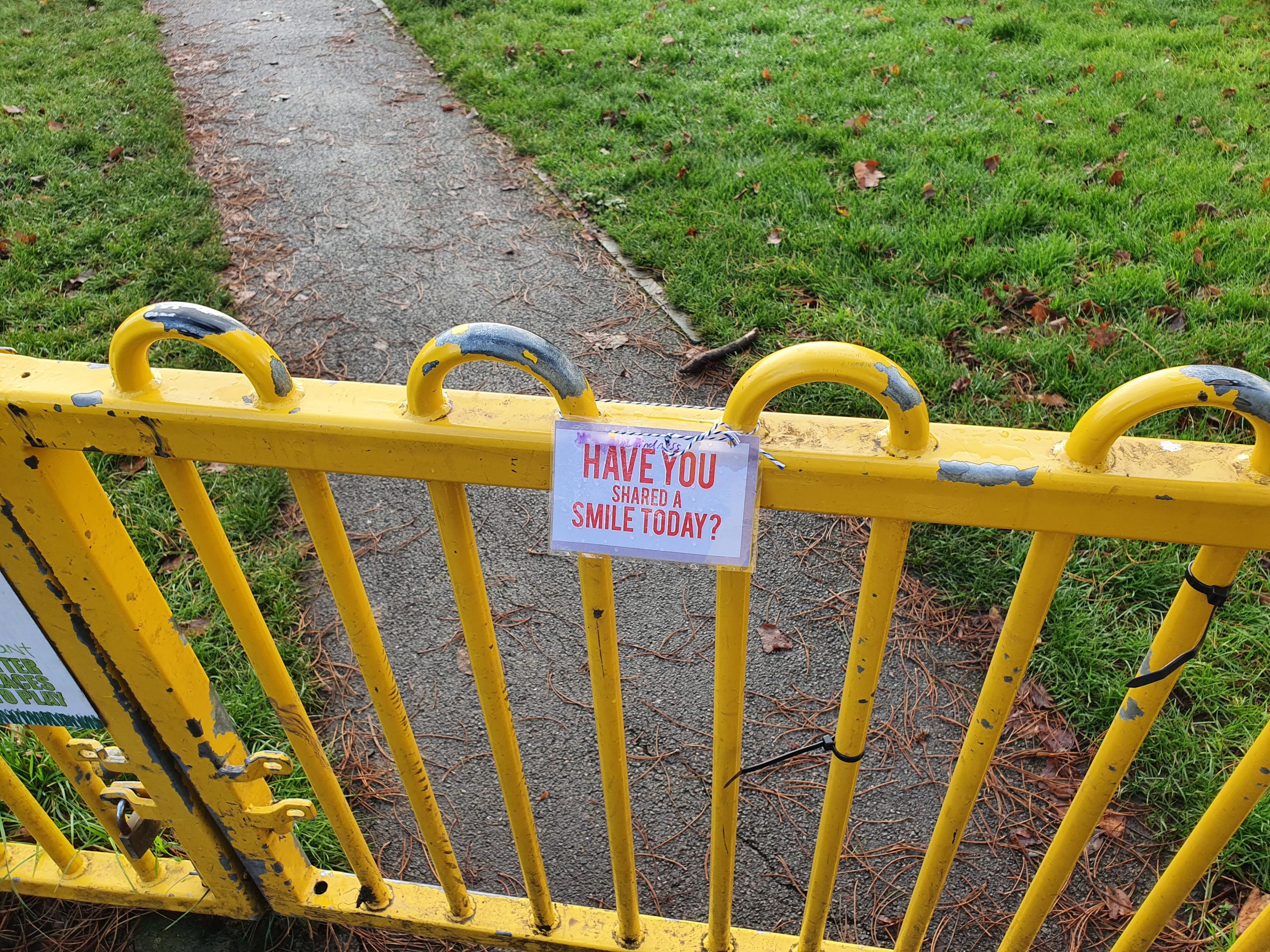 Opposite the orange food van, someone has been spreading positivity during lockdown in the form of a laminated note stuck to the gate of the playground that reads: ‘Have you shared a smile yet today?’.