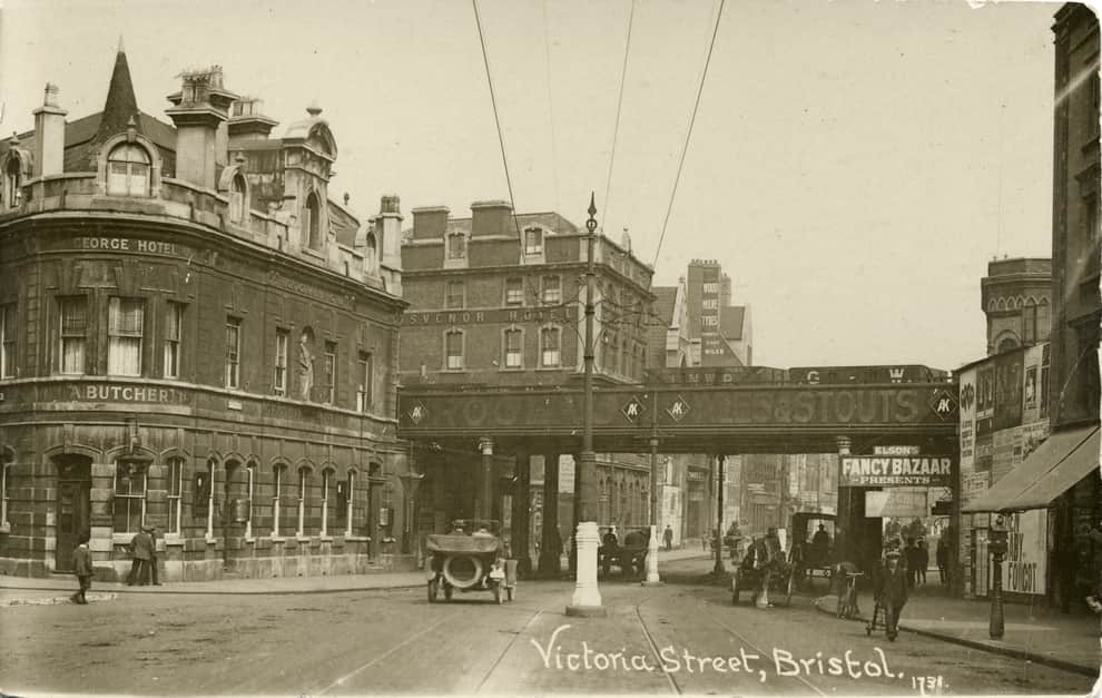 A railway bridge went directly next to the Grosvenor Hotel many years before the infamous flyover was built – photo: Bristol Archives