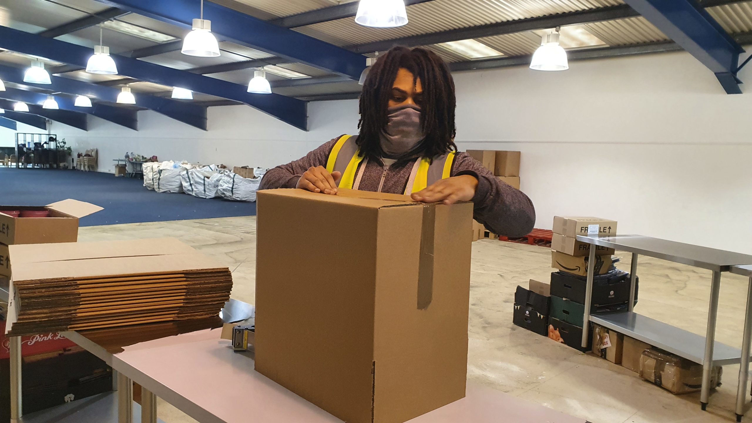 Volunteers in bright yellow tabards are carefully packing items into unlabeled cardboard boxes at the end of a vast warehouse on Winterstoke Road.