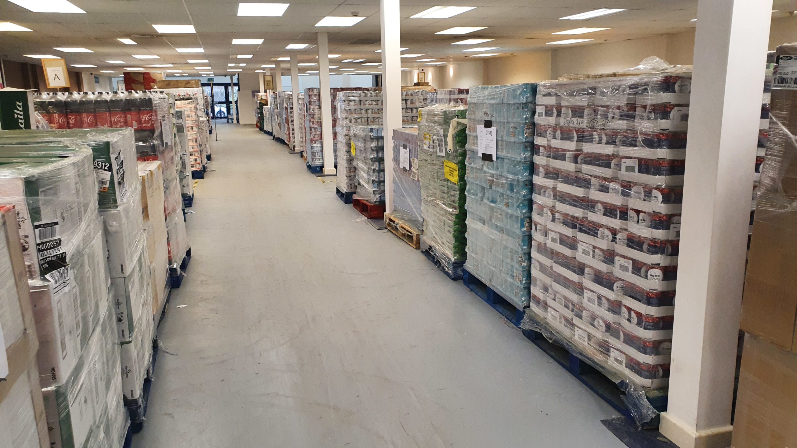 Patterned wallpaper and the odd faded sign on the walls hint at the former use of the warehouse, which was a bed showroom that stood empty for several years before FareShare South West quickly brought it back into use in the summer to fulfil a desperate need for space to store and distribute vital supplies.