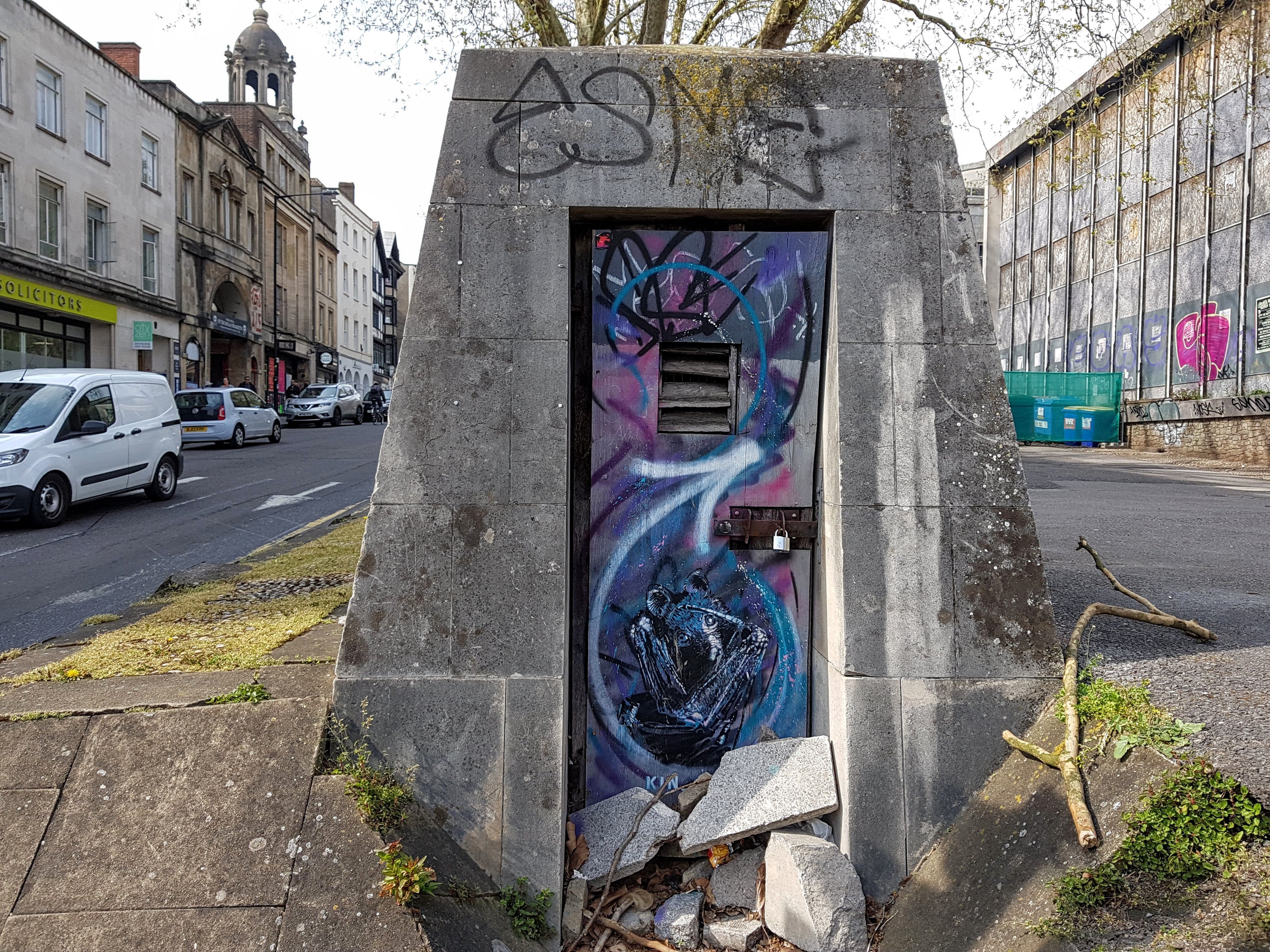 A graffiti-marred concrete obelisk in front of the derelict Bank of England building by Castle Park goes unnoticed by many who pass it each day.