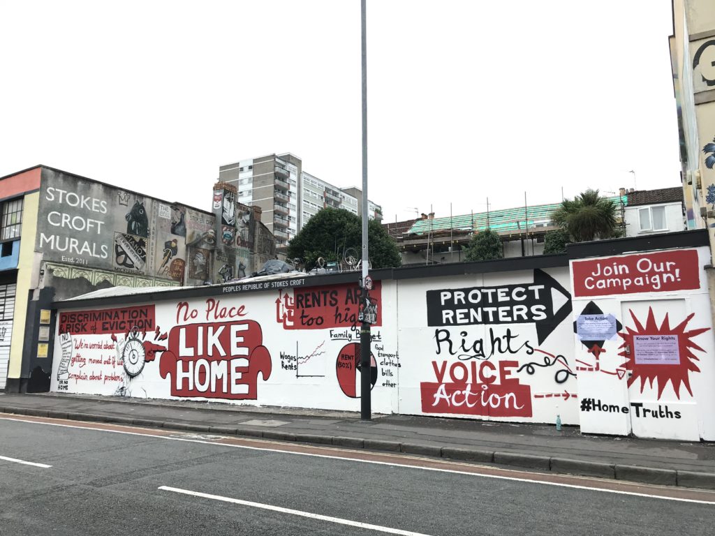One renter involved in the campaign, artist Benoit Bennett, painted a mural in Stokes Croft to highlight rental issues including discrimination and fear; and statistics such as the fact that, on average, private renters spend 50 per cent of their income on rent.