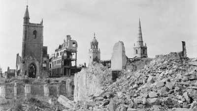 Today, the names of hundreds of civilians and auxiliary personnel who died in the city in bombing raids carried out between 1940 and 1944 are remembered on the side of the ruined St Peter’s Church, itself a memory of the horrors of 80 years ago.