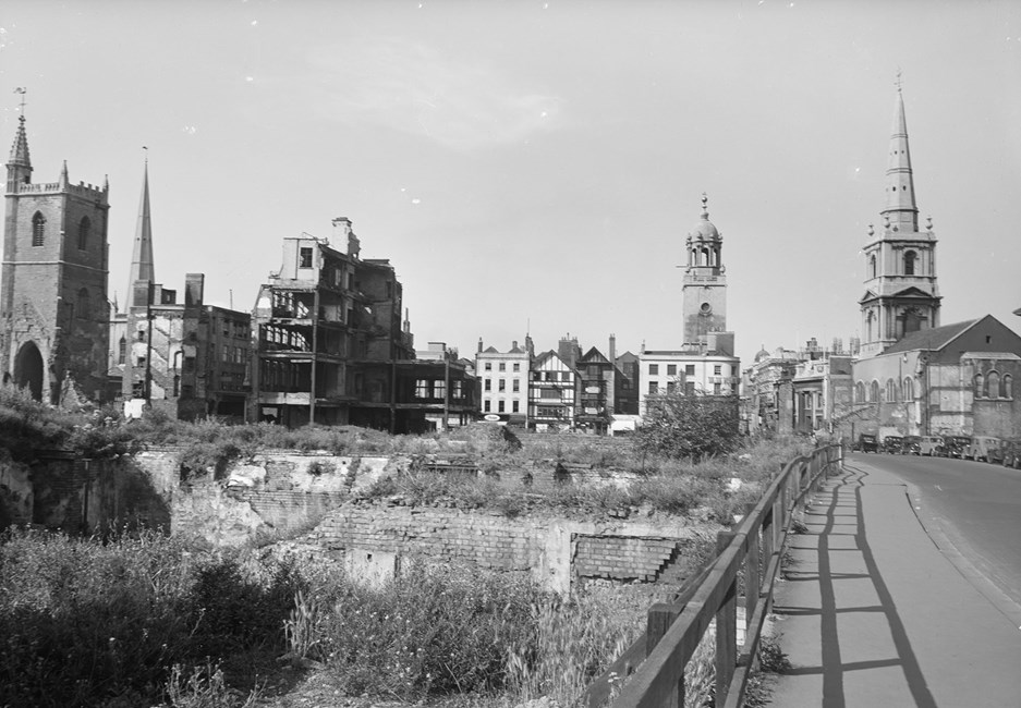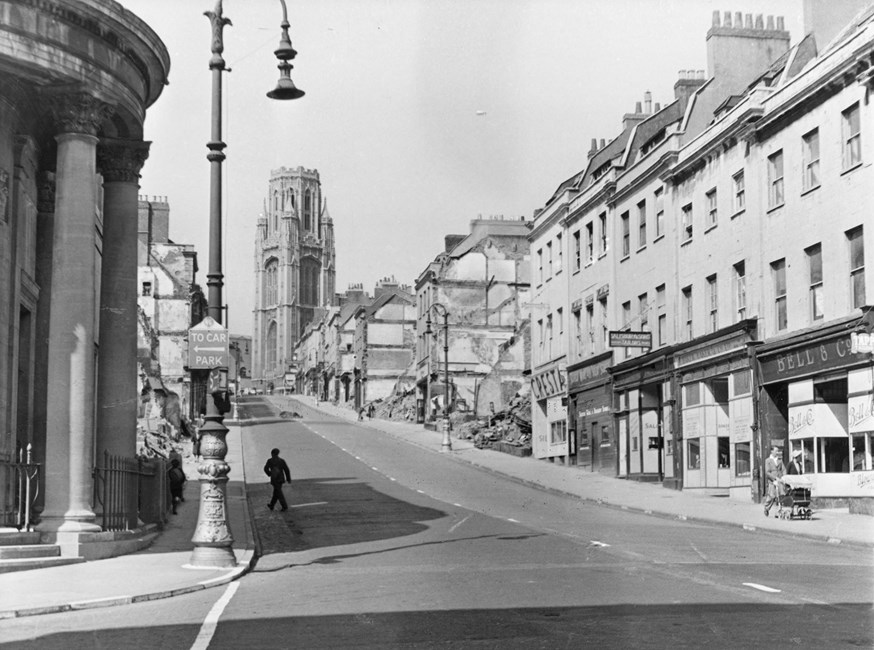 A view from 1950, looking along Wine Street past cleared bomb damage towards All Saints’ Church in the centre of Bristol © Historic England Archive. BB77/06721